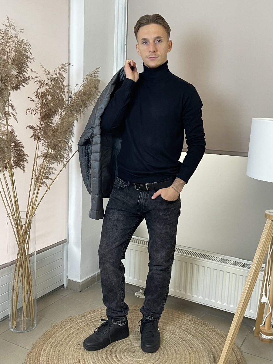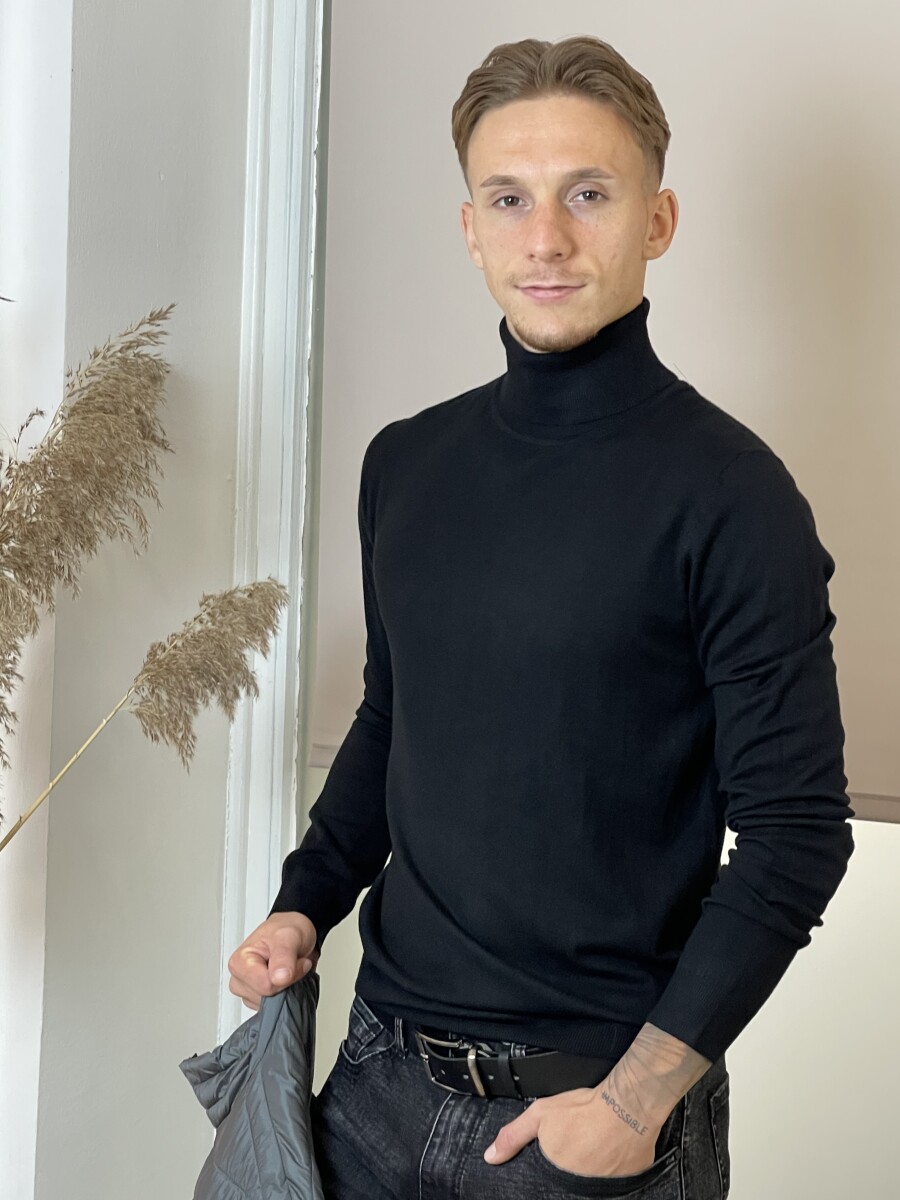 Ujj, derék és nyak résznél passzés, garbó nyakú, finom kötésű férfi pulóver .