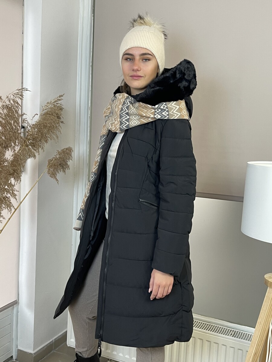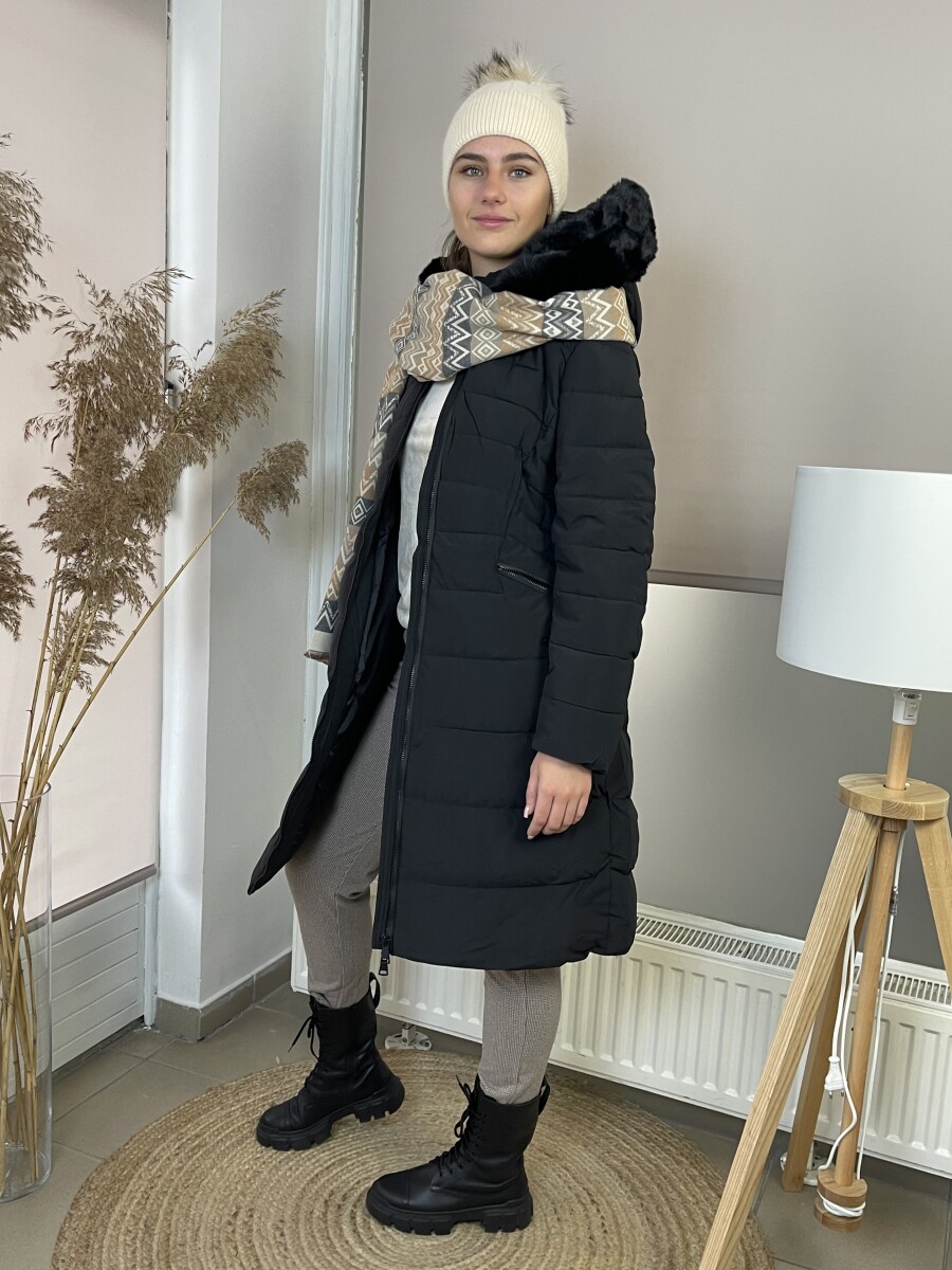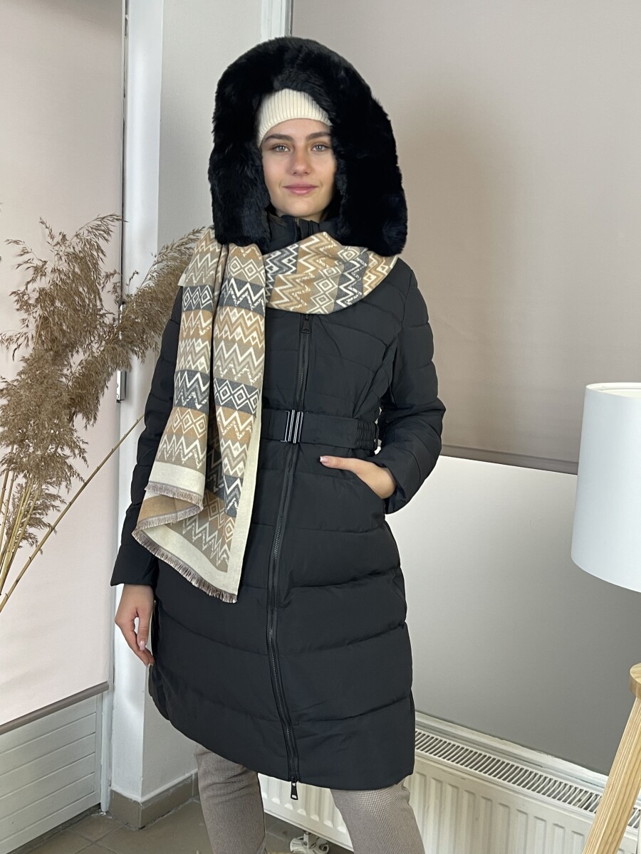Karcsúsított fazonú, derekán rugalmas gumis fém csatos öves, levehető szőrmés kapucnis, (szőrme külön legombolható), selyem szerű béléses, vastagon bélelt, steppelt női hosszú télikabát .