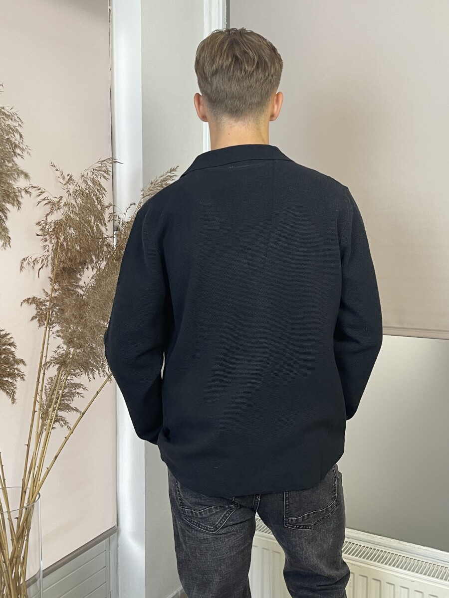 Vágott sálgalléros, két zsebes, 3 gombbal záródó kötött férfi kardigán .