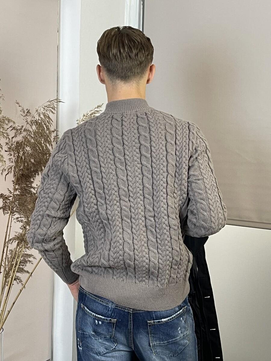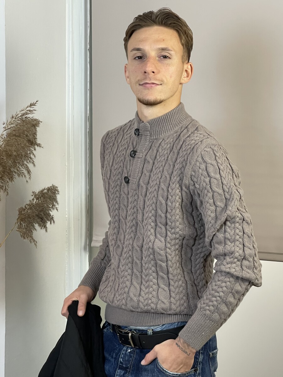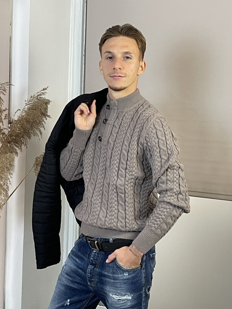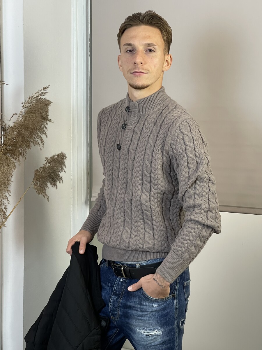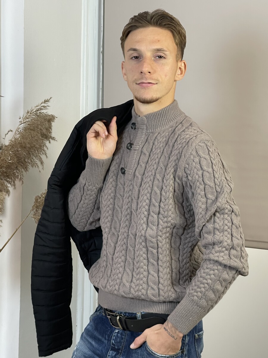Ujj, derék és nyak résznél passzés, kerek álló nyakú, nyak résznél felvágott 3 gombbal záródó, csavart mintás, finom kötésű vastag férfi pulóver .
