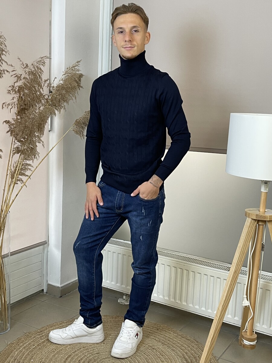 Ujj, derék és nyak résznél passzés, garbó nyakú, csavart mintás, finom kötésű férfi pulóver .