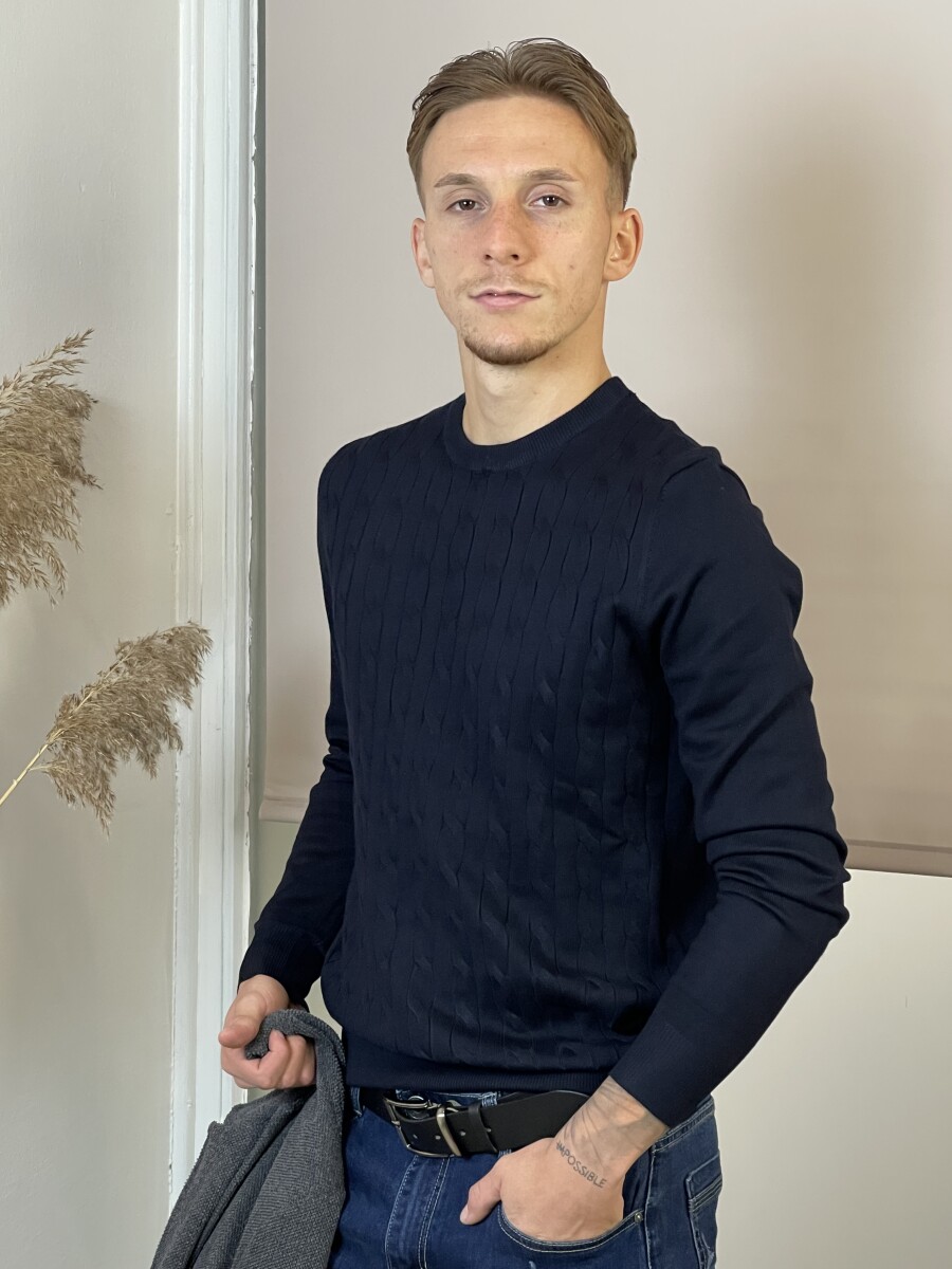 Ujj, derék és nyak résznél passzés, kerek nyakú, csavart mintás, finom kötésű férfi pulóver .
