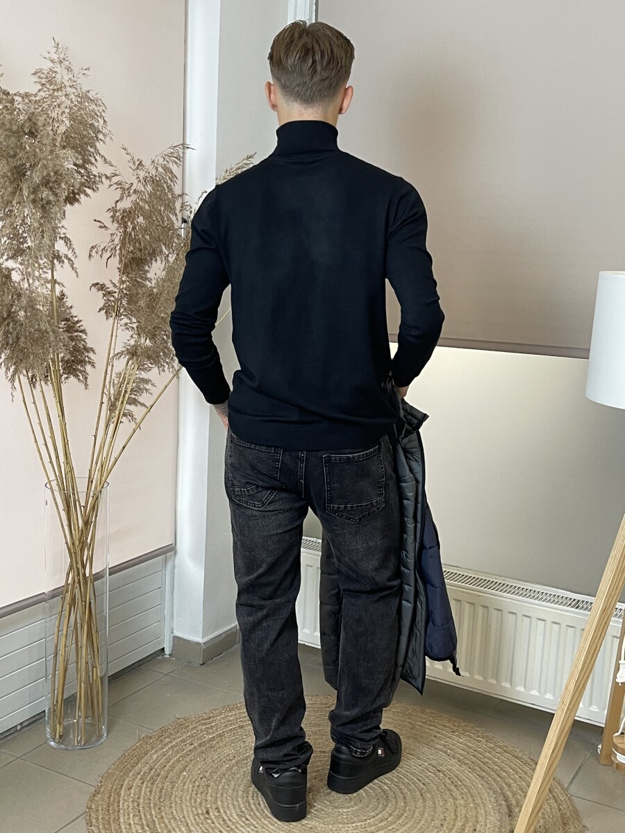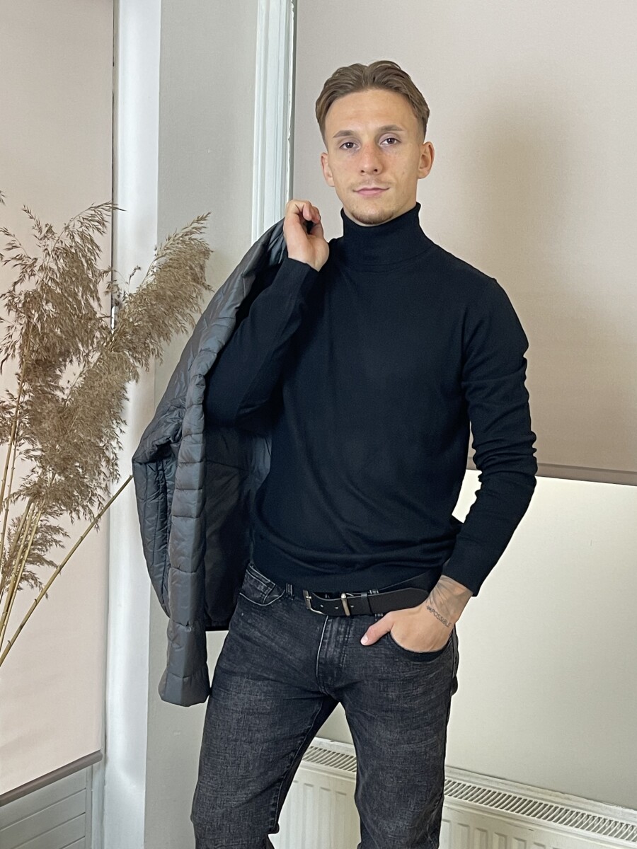 Ujj, derék és nyak résznél passzés, garbó nyakú, finom kötésű férfi pulóver .