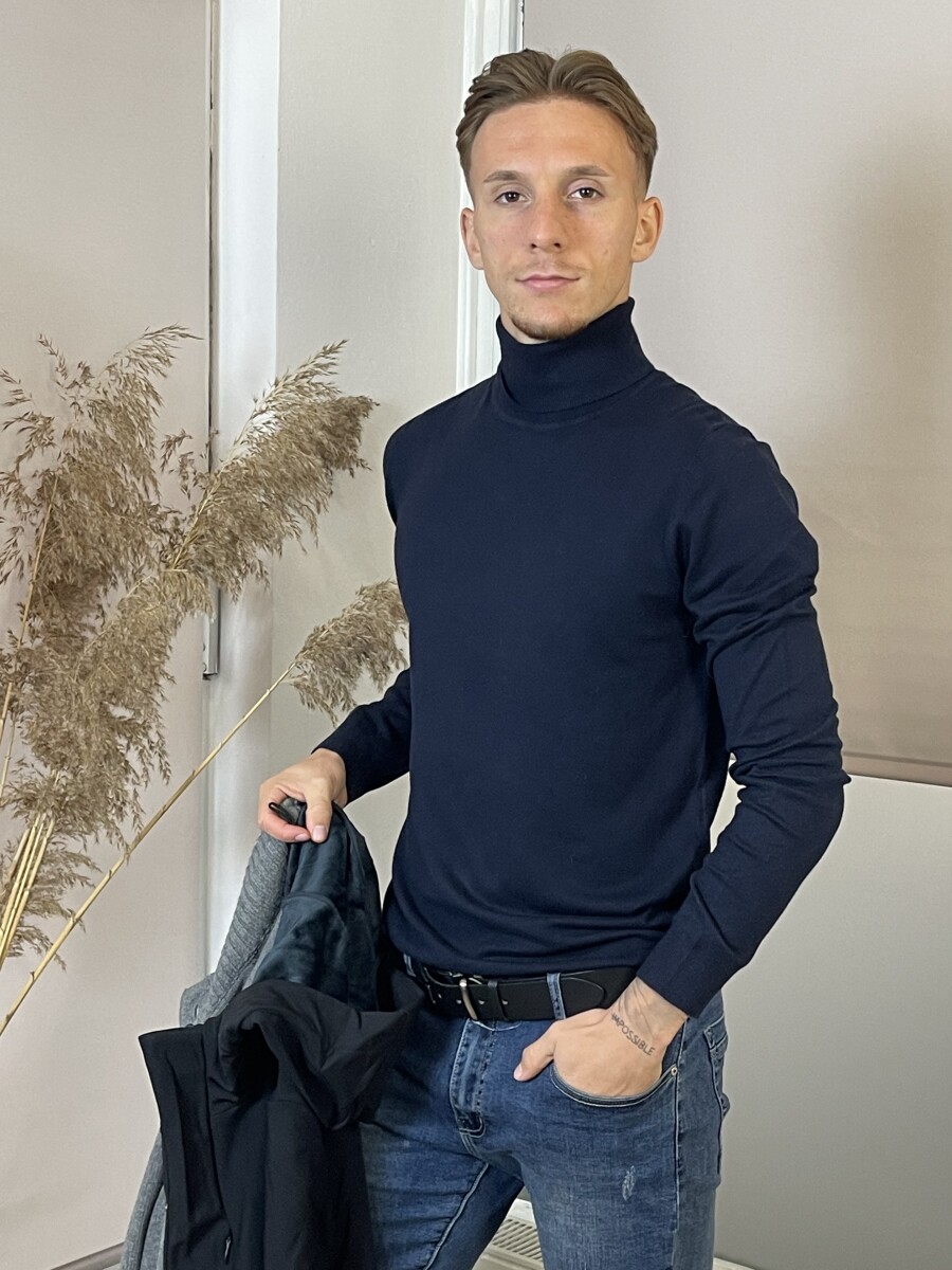 Ujj, derék és nyak résznél passzés, garbó nyakú, finom kötésű férfi pulóver .