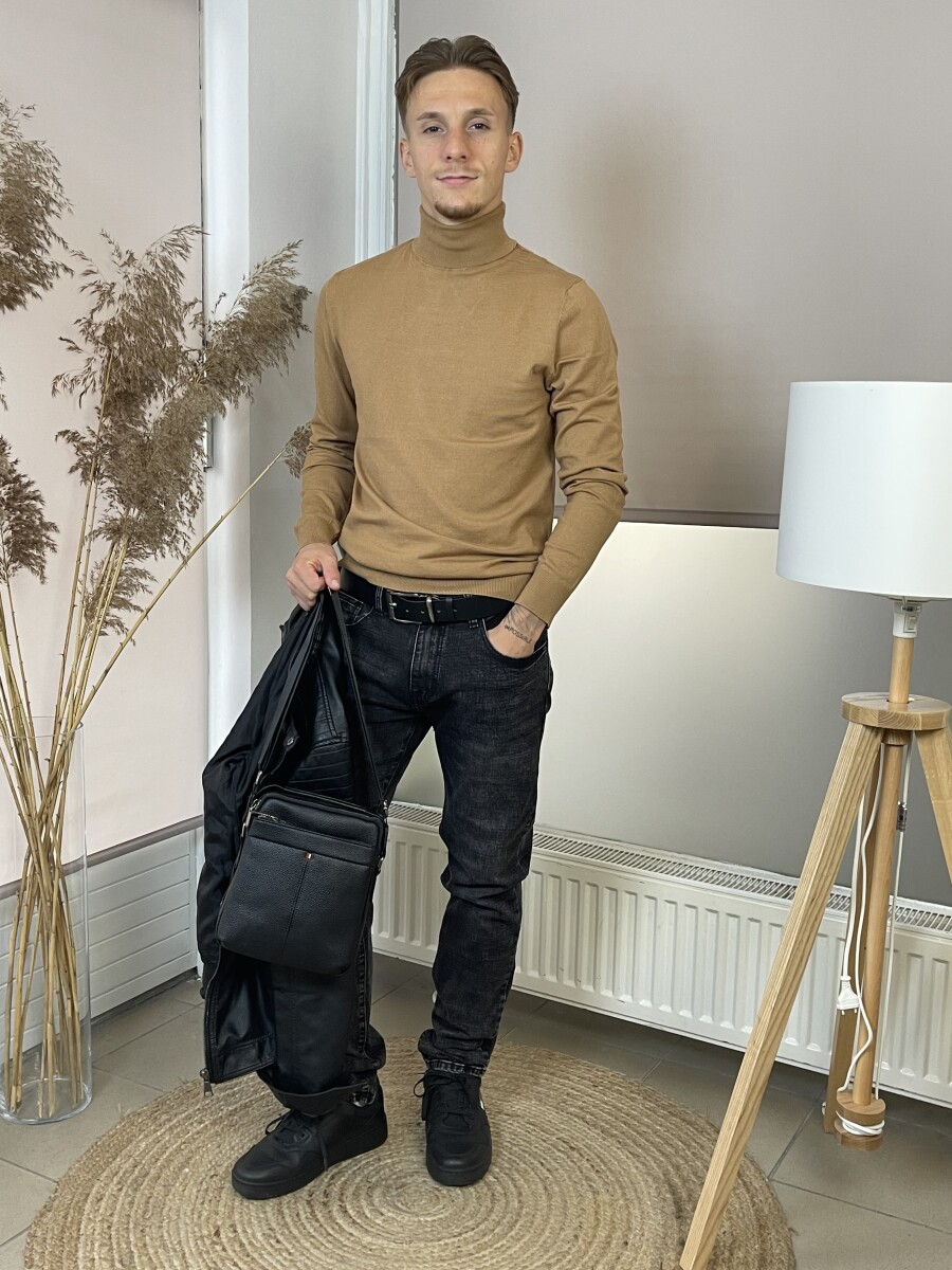 Ujj, derék és nyak résznél passzés, garbó nyakú, finom kötésű férfi pulóver .