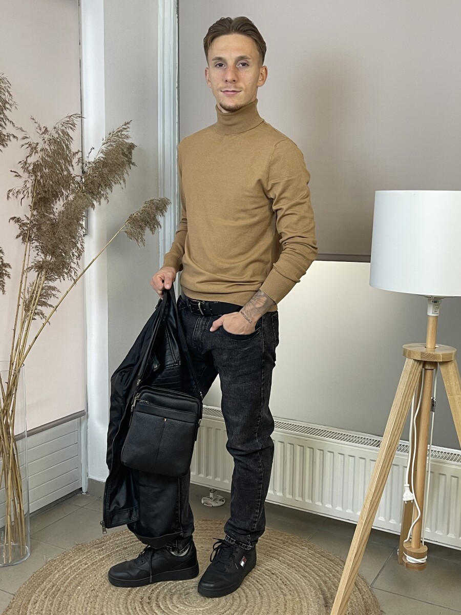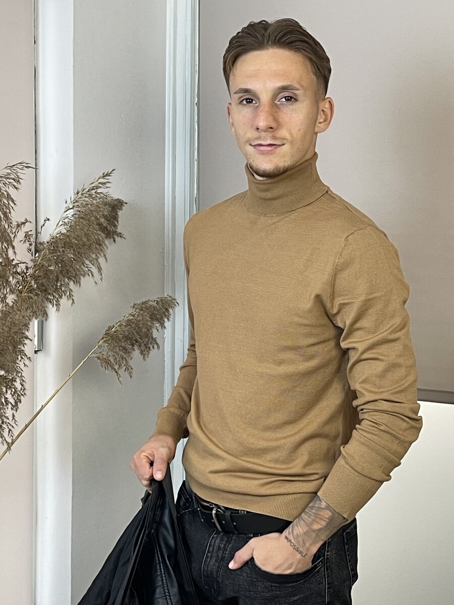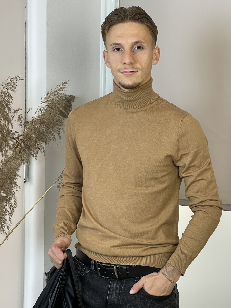 Ujj, derék és nyak résznél passzés, garbó nyakú, finom kötésű férfi pulóver .