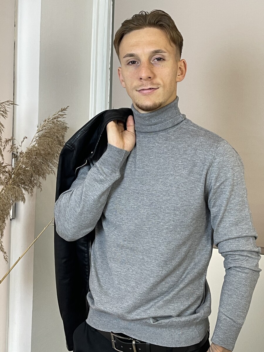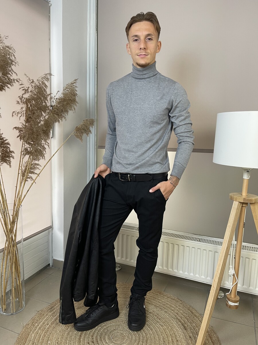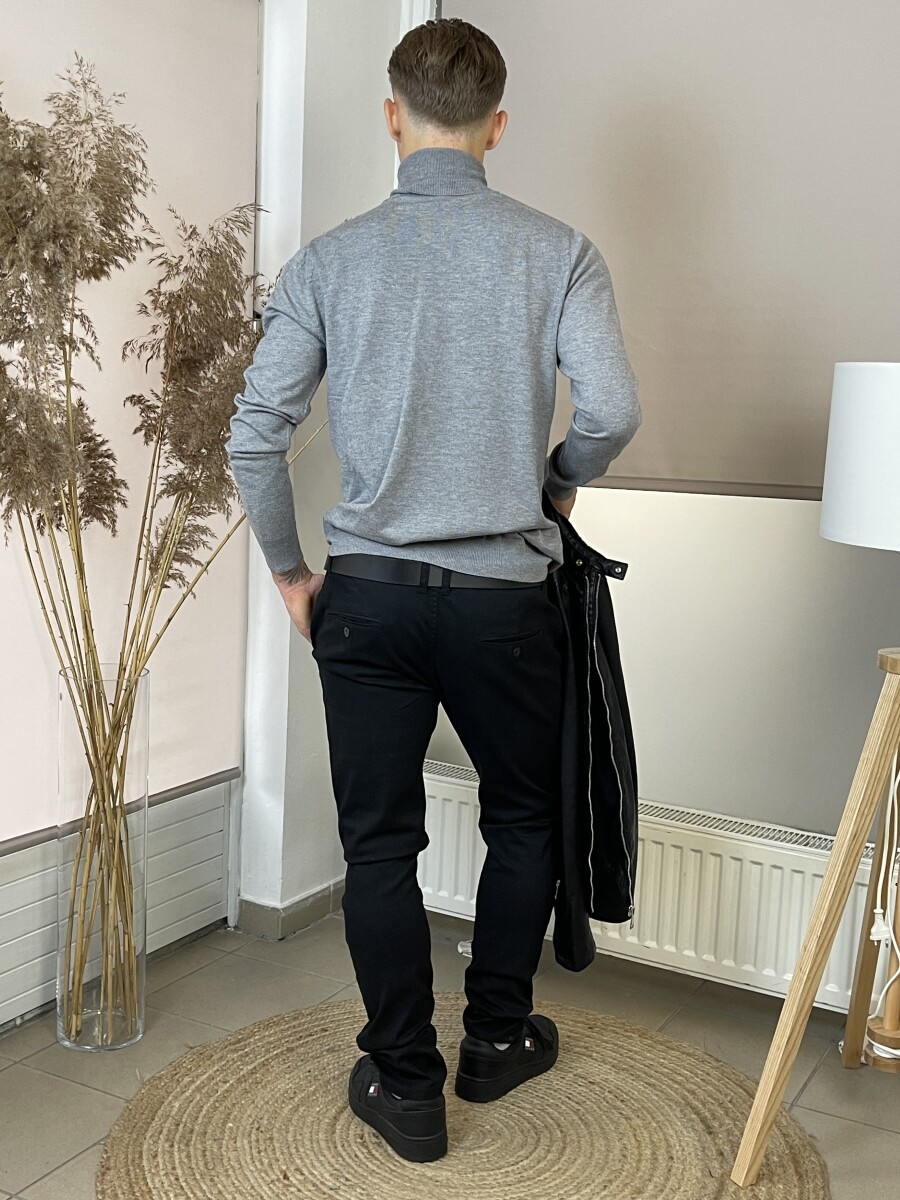 Ujj, derék és nyak résznél passzés, garbó nyakú, finom kötésű férfi pulóver .