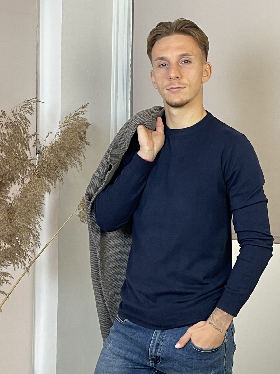 Ujj, derék és nyak résznél passzés, kerek nyakú, vékony kötésű férfi kötött pulóver .