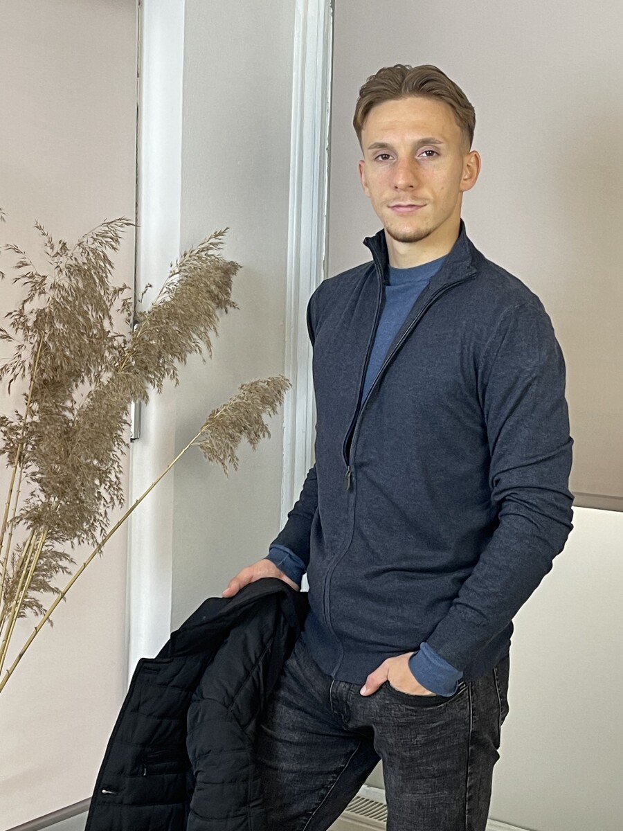 Ujj, derék és nyak résznél passzés, álló nyakú , teljes hosszban cipzáras vékony kötött férfi kardigán .