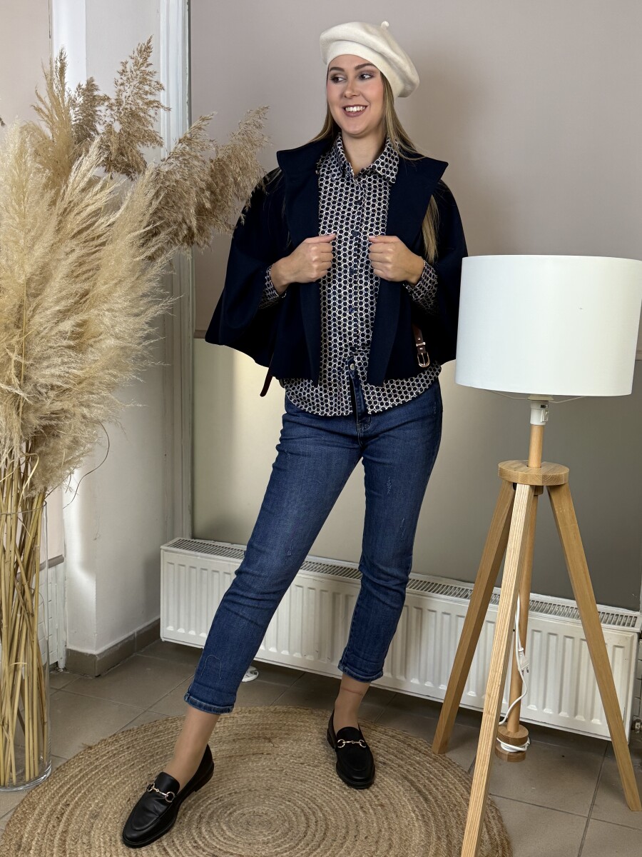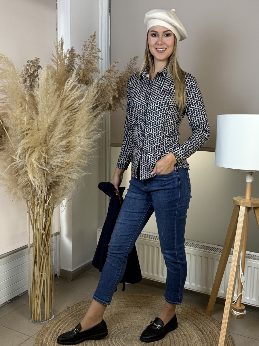 Egyenes vonalú, ing galléros, elől gombbal záródó ing .Anyaga rugalmas és puha tapintású, ujjvégei passzéval záródnak .