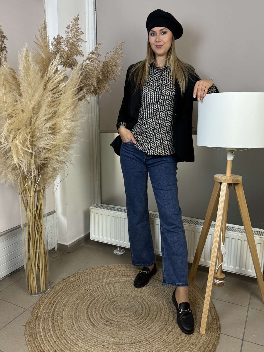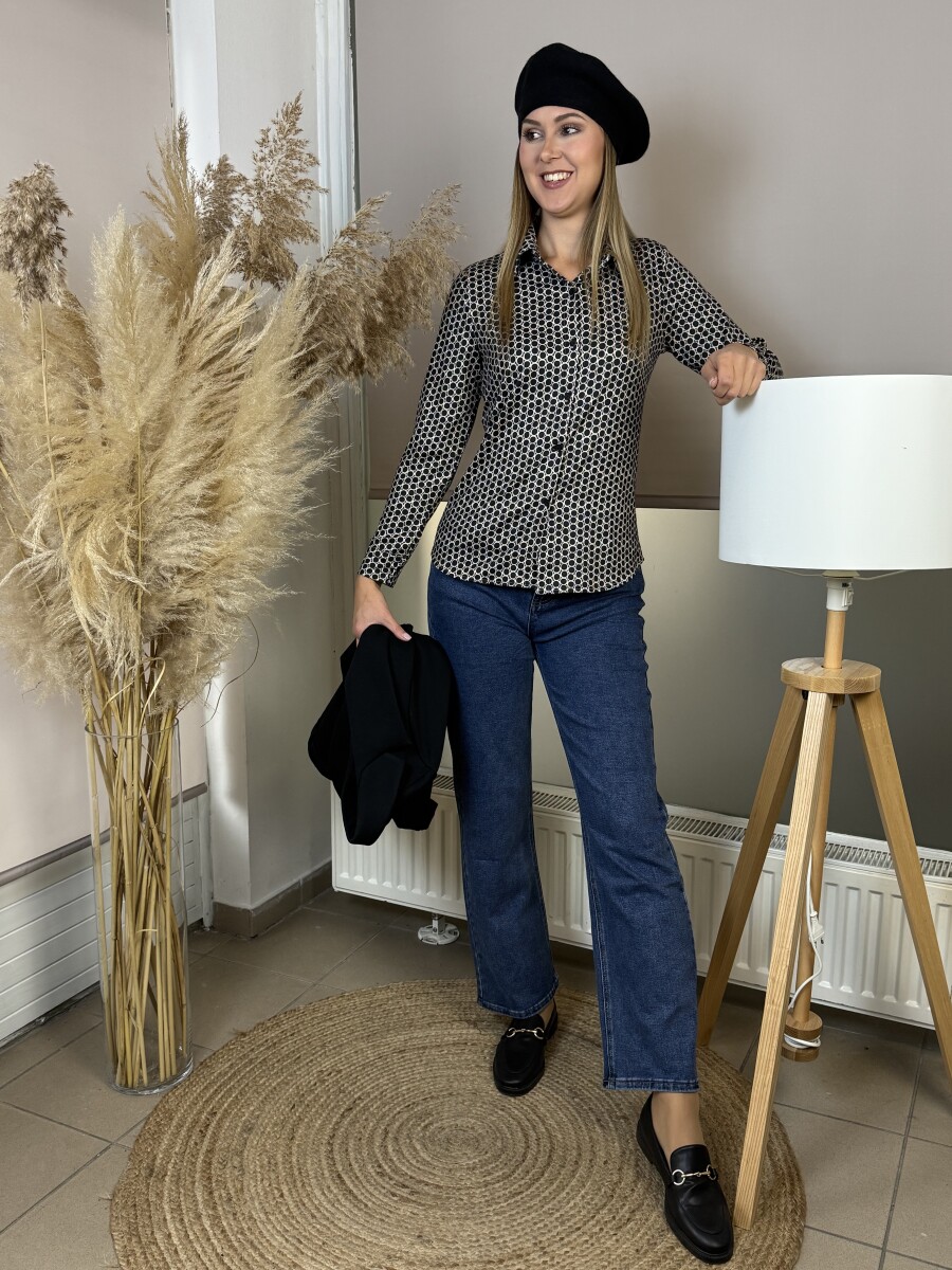 Egyenes vonalú, ing galléros, elől gombbal záródó ing .Anyaga rugalmas és puha tapintású, ujjvégei passzéval záródnak .
