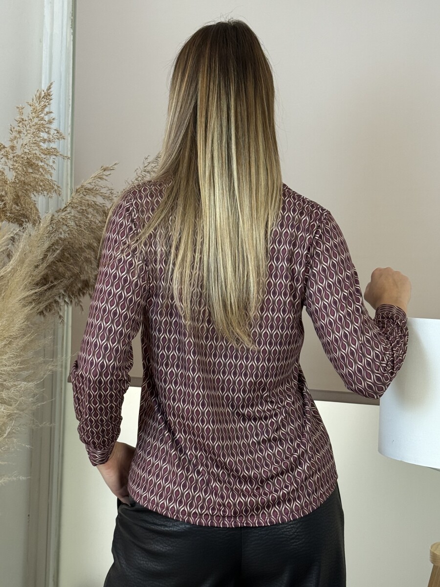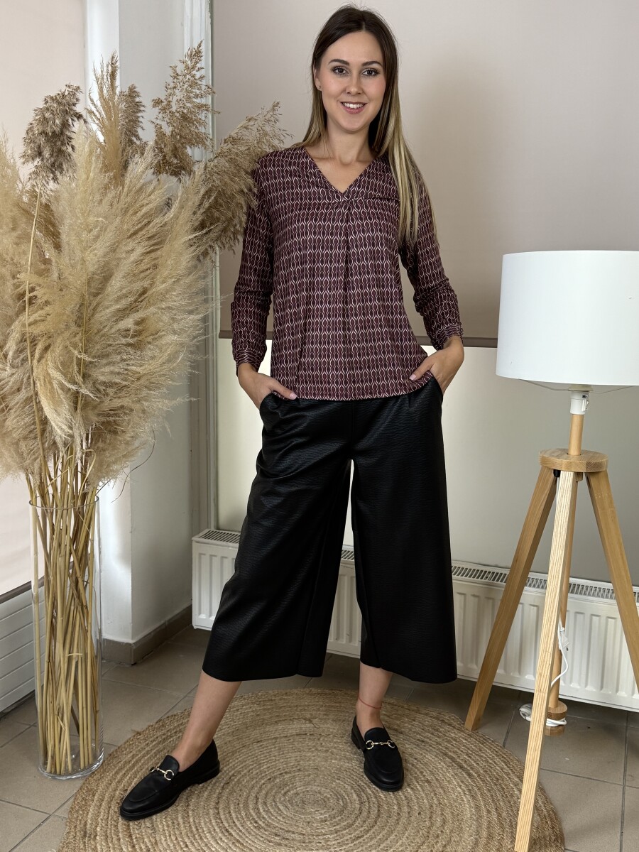 V nyakkivágású, lezser fazonú, ujjvégeken passzés, elöl csípett, hosszú ujjú mintás blúz .