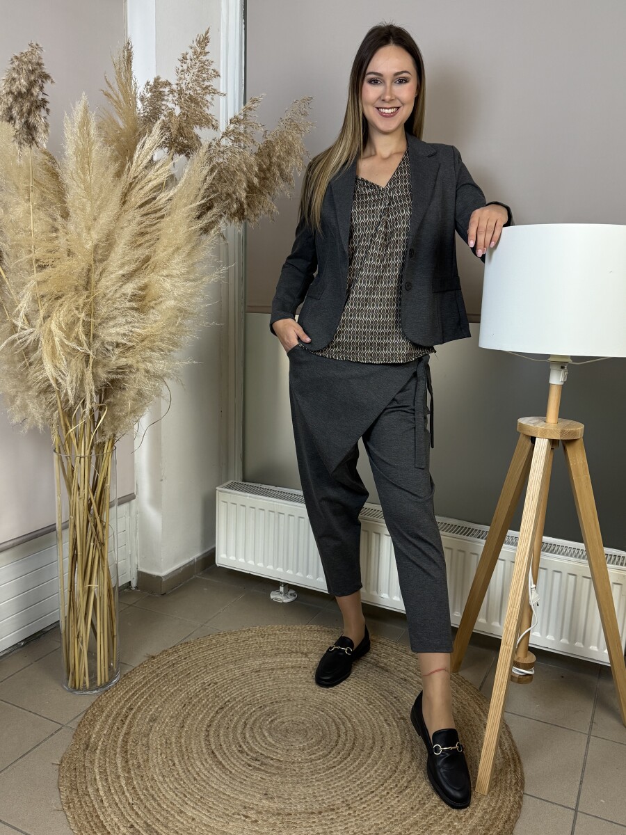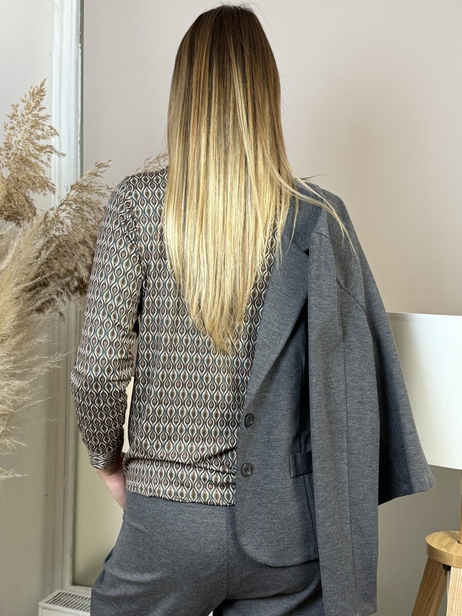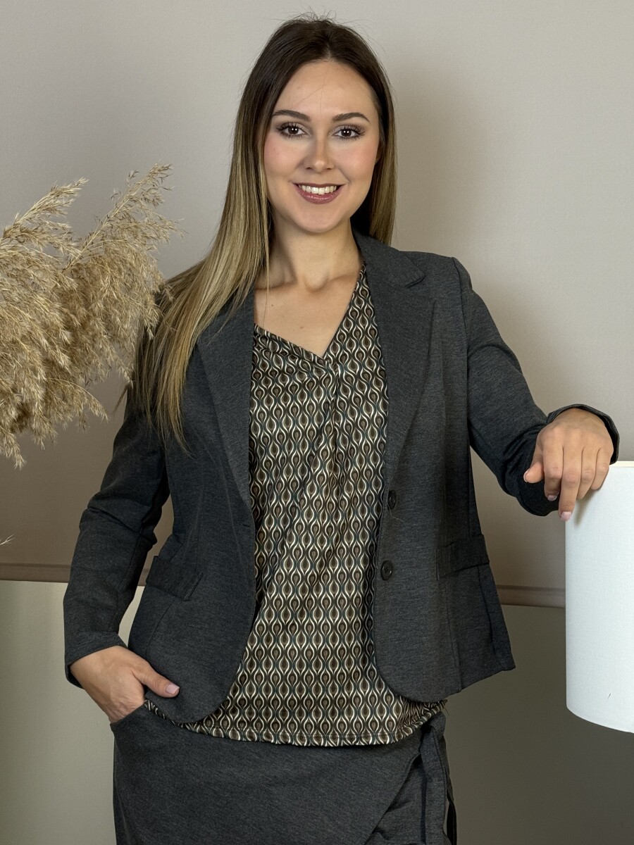 V nyakkivágású, lezser fazonú, ujjvégeken passzés, elöl csípett, hosszú ujjú mintás blúz .