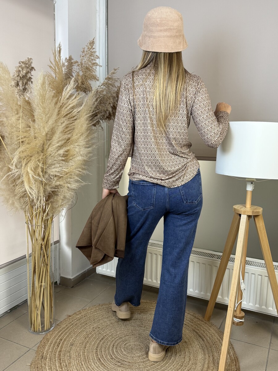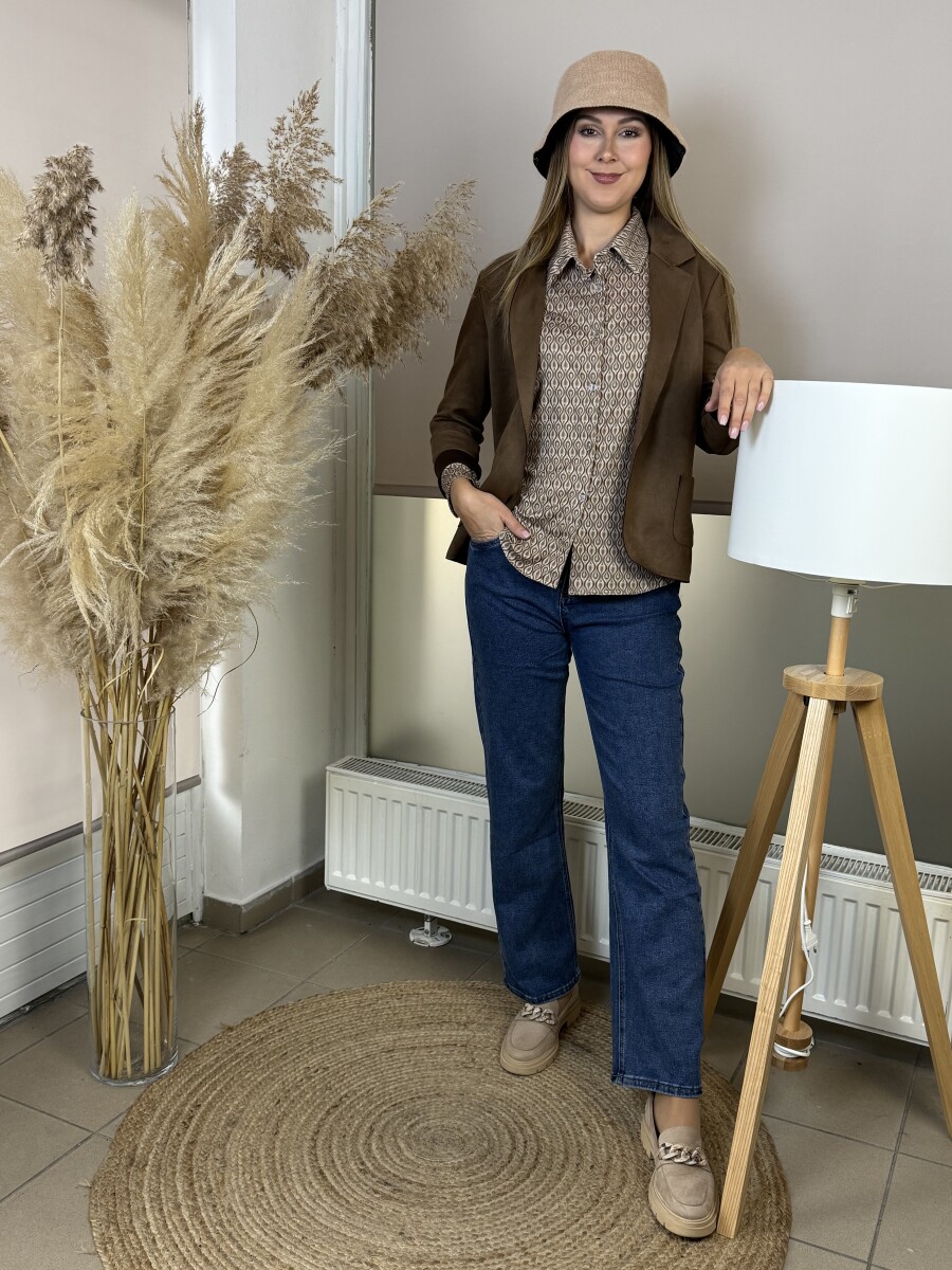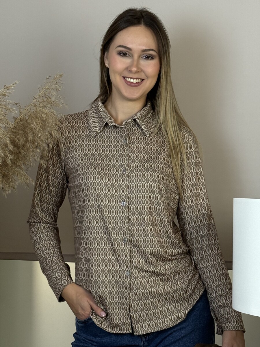 Egyenes vonalú, ing galléros, elől gombbal záródó ing .Anyaga rugalmas és puha tapintású, ujjvégei passzéval záródnak .