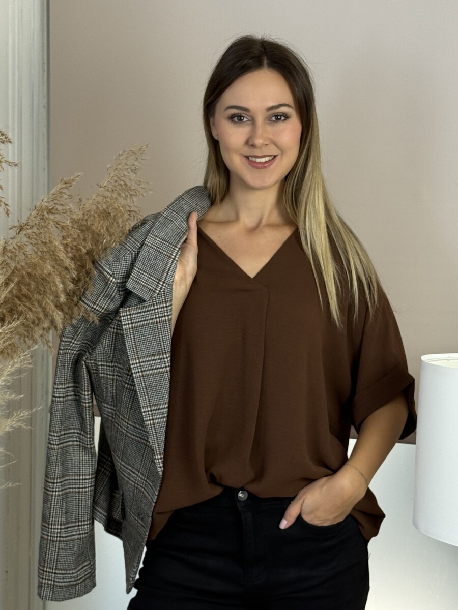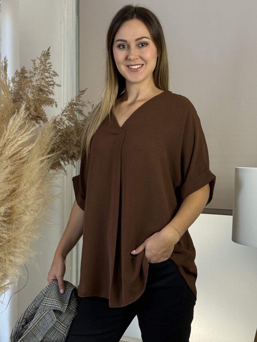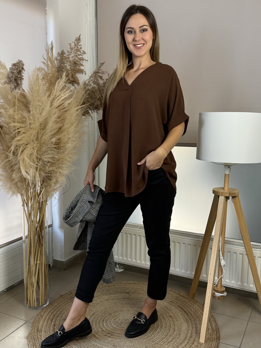 T ujjú, egyenes vonalú, laza szabású, ujj végen vissza hajtott, V nyakú, mell részen csipett lenge anyagú blúz .