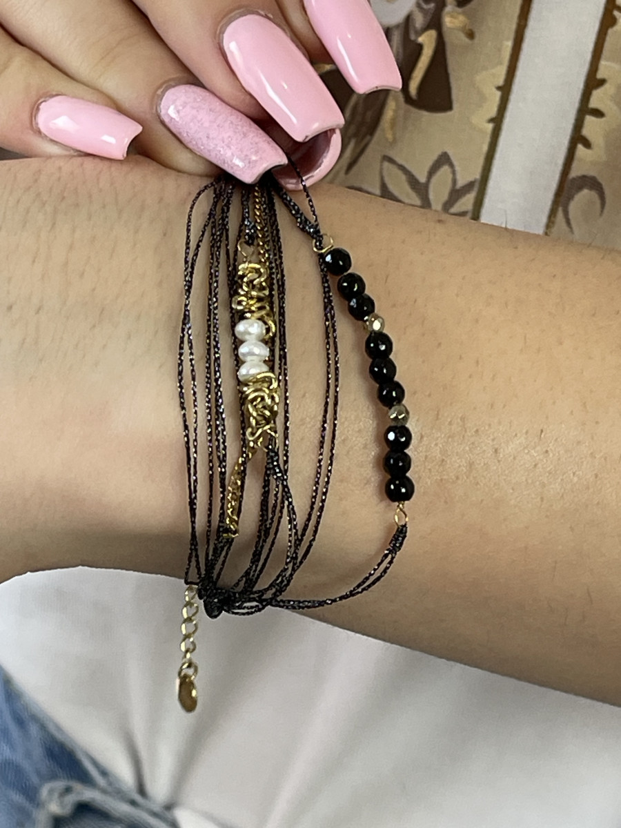 Selyem fényű, selyem szálas, apró gyöngyökkel díszített karkötő .