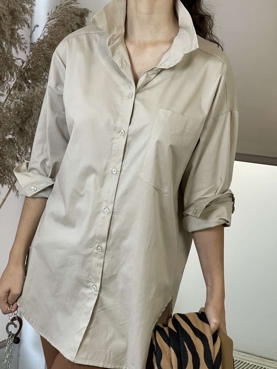 Egyenes vonalú, hosszú ujjú, ujjvégeken gombolással, passzéval záródó, hátul hosszított, oldalán felsliccelt blúz inggallérral, mell részen zsebbel . Rugalmas pamutvászon anyag ,kényelmes lezser viselet .
