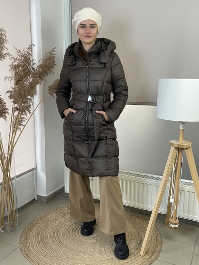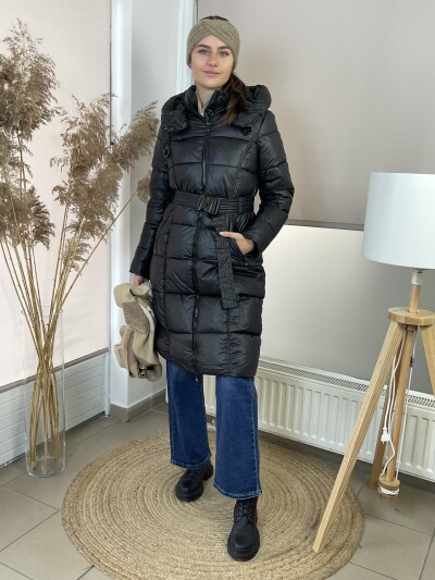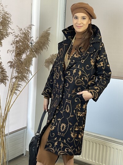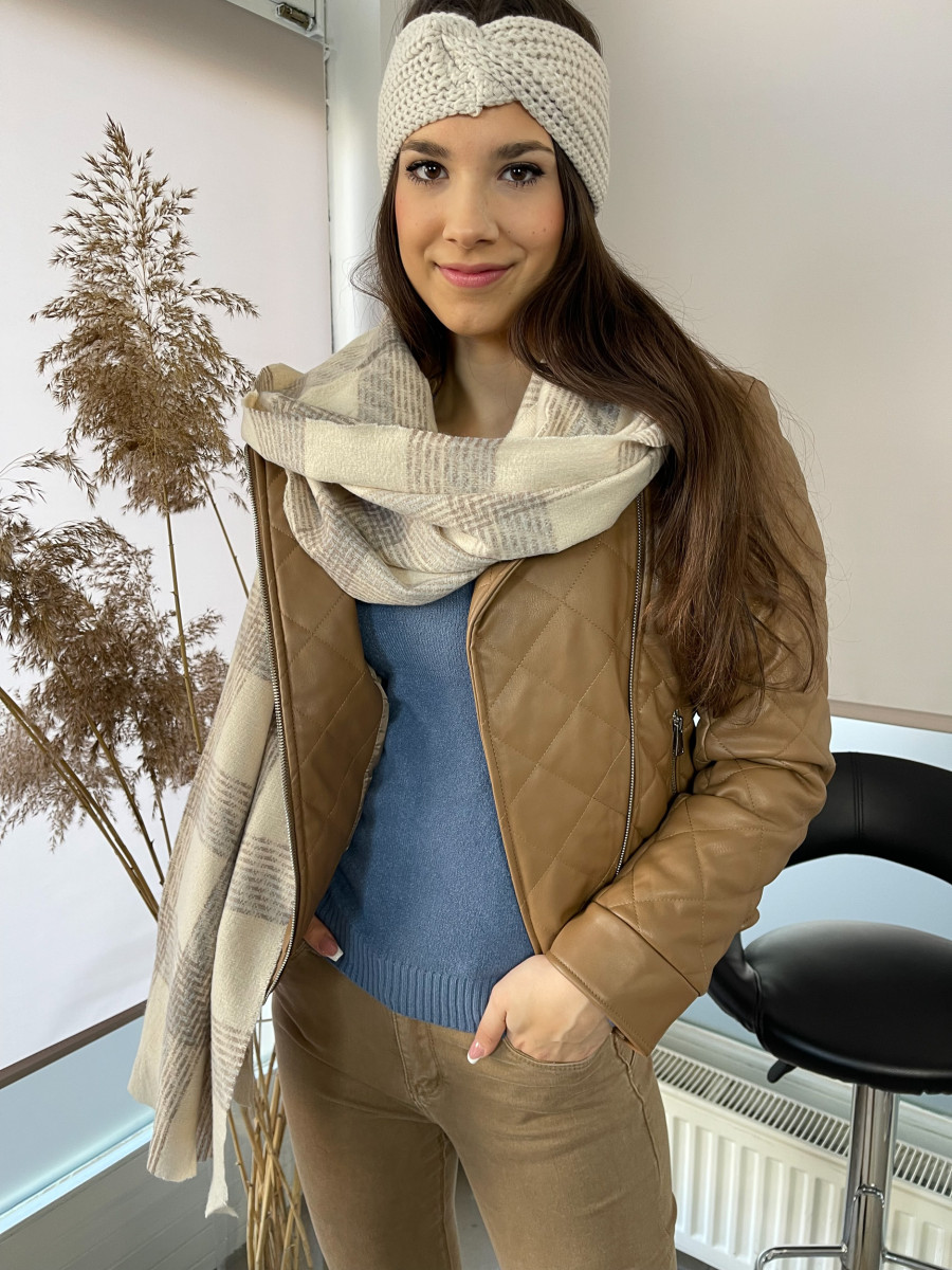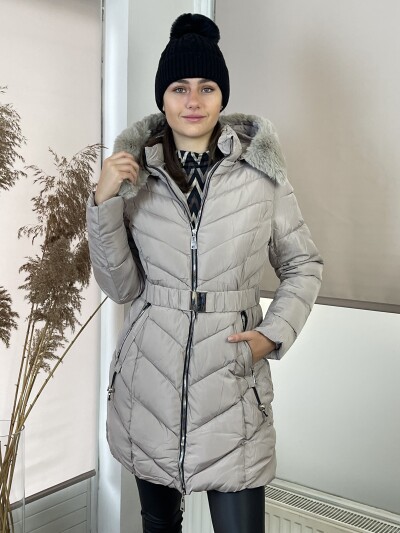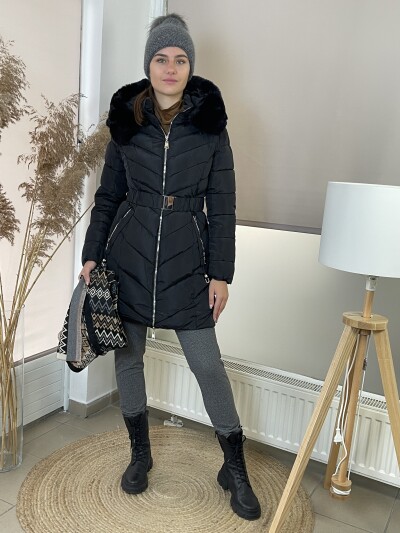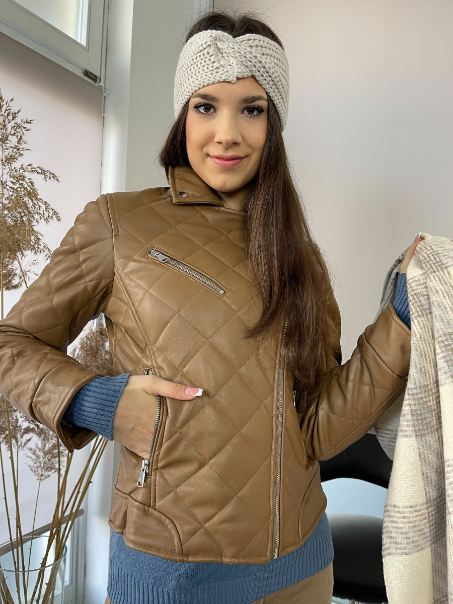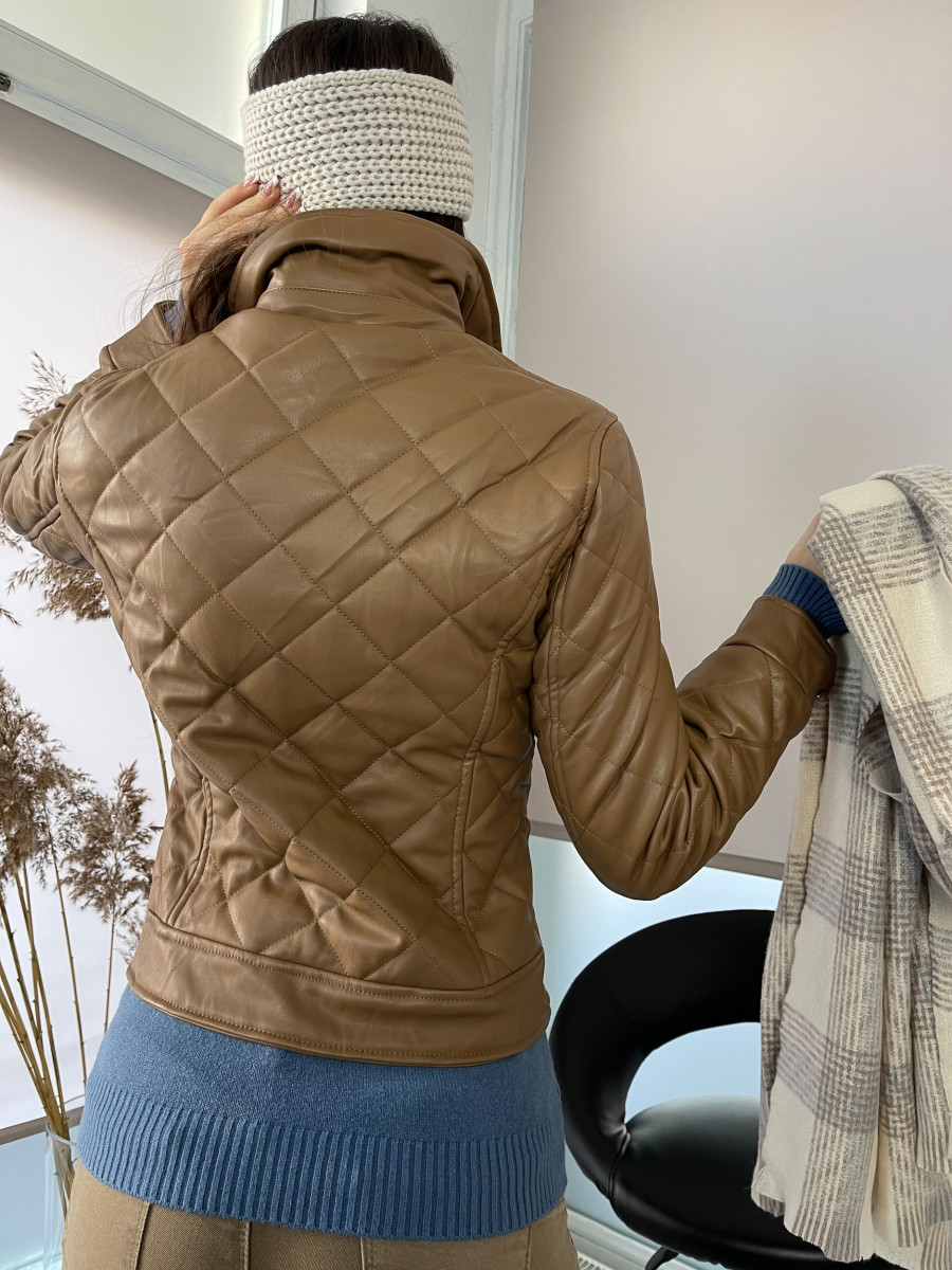 Karcsúsított fazonú, rövid derekú, steppelt, cipzárral záródó bélelt műbőr kabát .