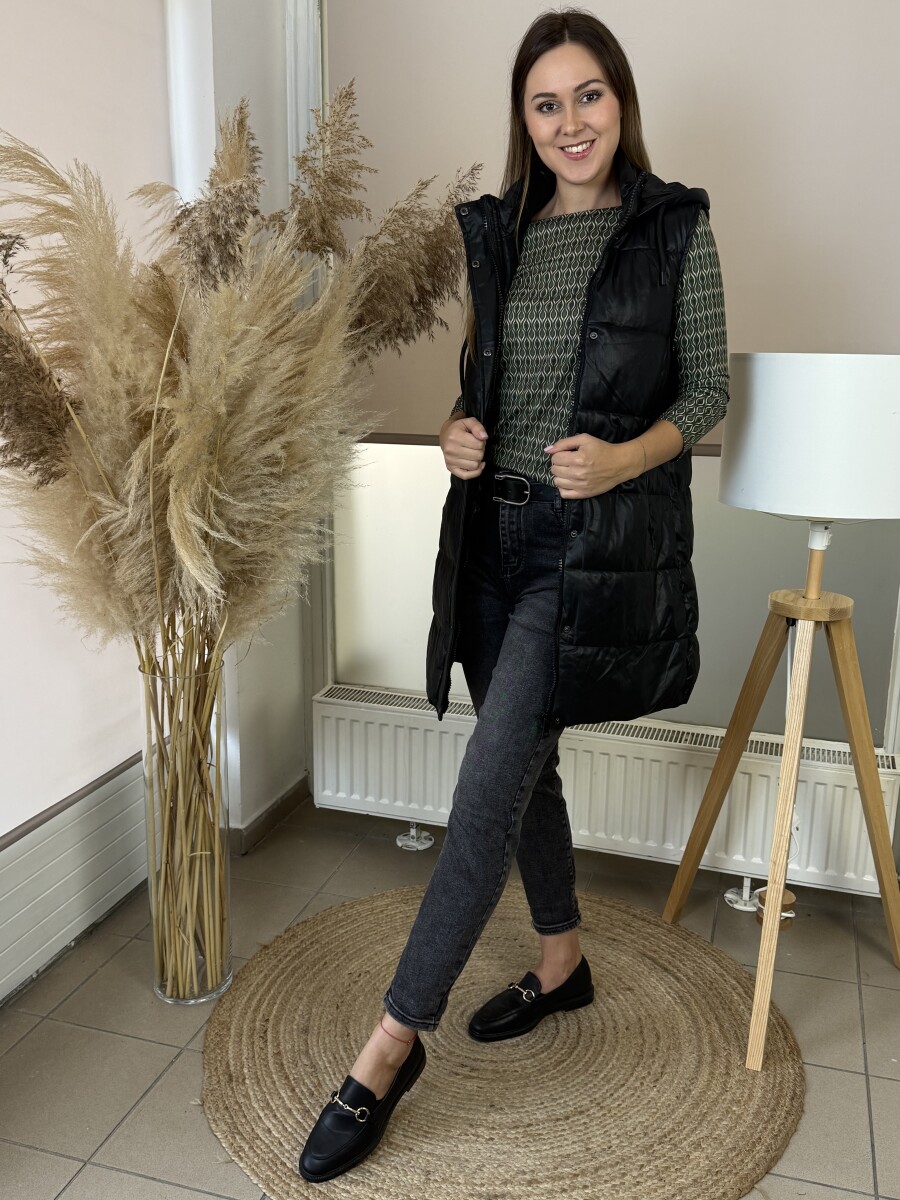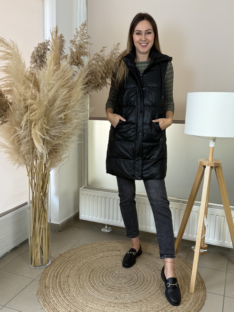 Hosszított egyenes fazonú, steppelt, béléses, kapucnis, elöl két zsebes, műbőr hatású, elől cipzárral és patenttal záródó mellény.