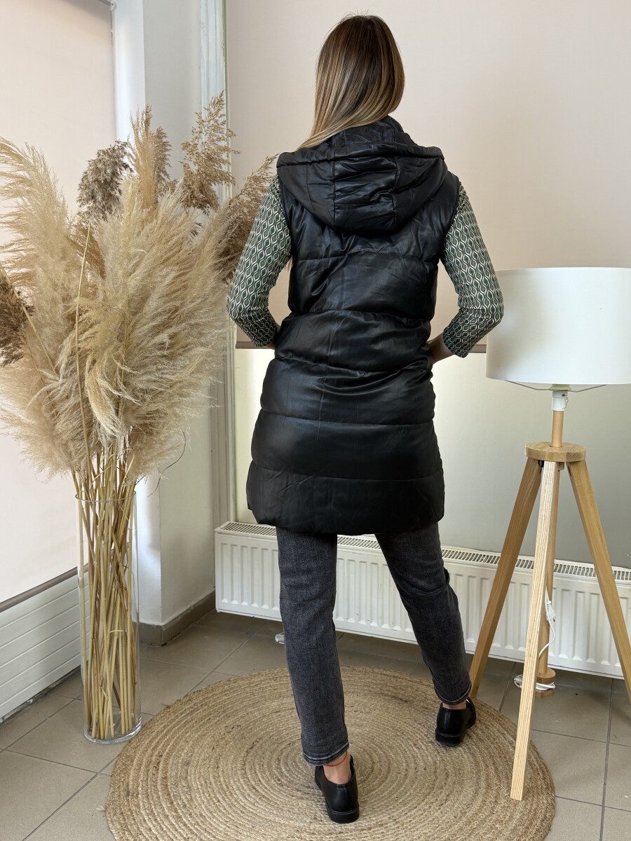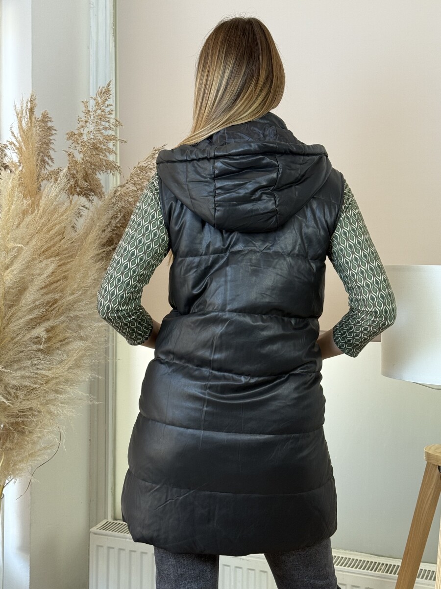 Hosszított egyenes fazonú, steppelt, béléses, kapucnis, elöl két zsebes, műbőr hatású, elől cipzárral és patenttal záródó mellény.