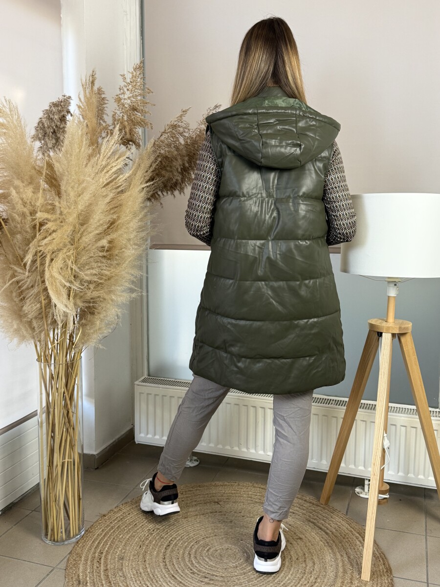 Hosszított egyenes fazonú, steppelt, béléses, kapucnis, elöl két zsebes, műbőr hatású, elől cipzárral és patenttal záródó mellény.