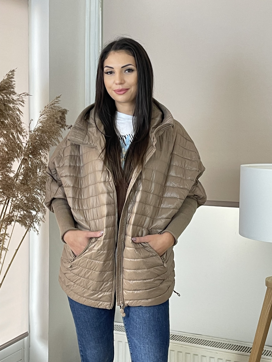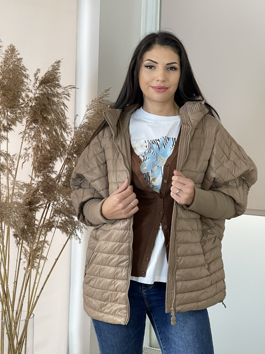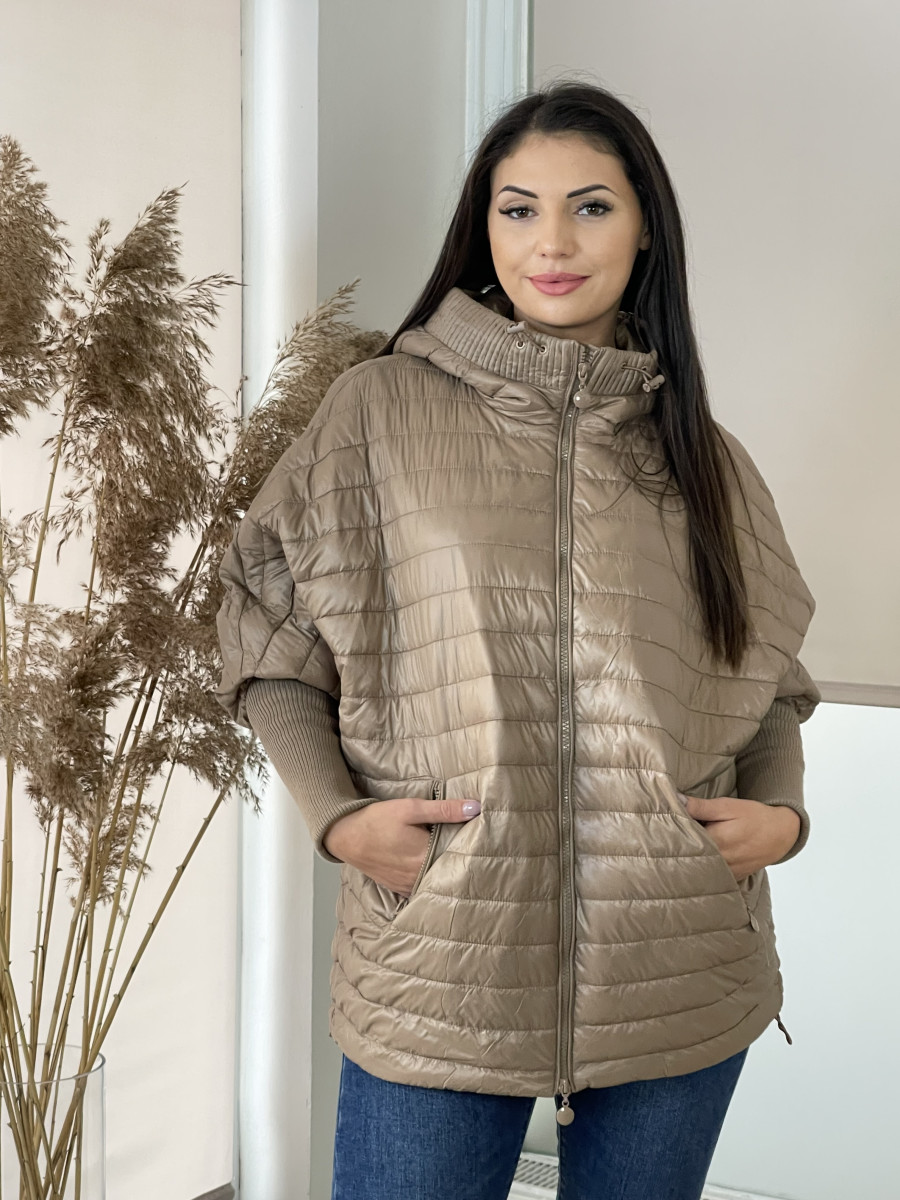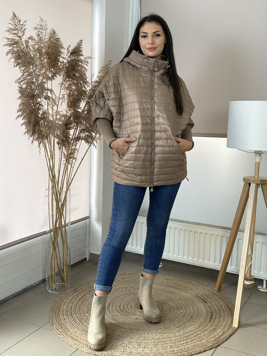 Denevérujjas, ujj végen széles kötött passzés, kapucnis ami nem levehető, cipzárral záródó steppelt őszi dzseki, oldalt két cipzáras zsebbel .