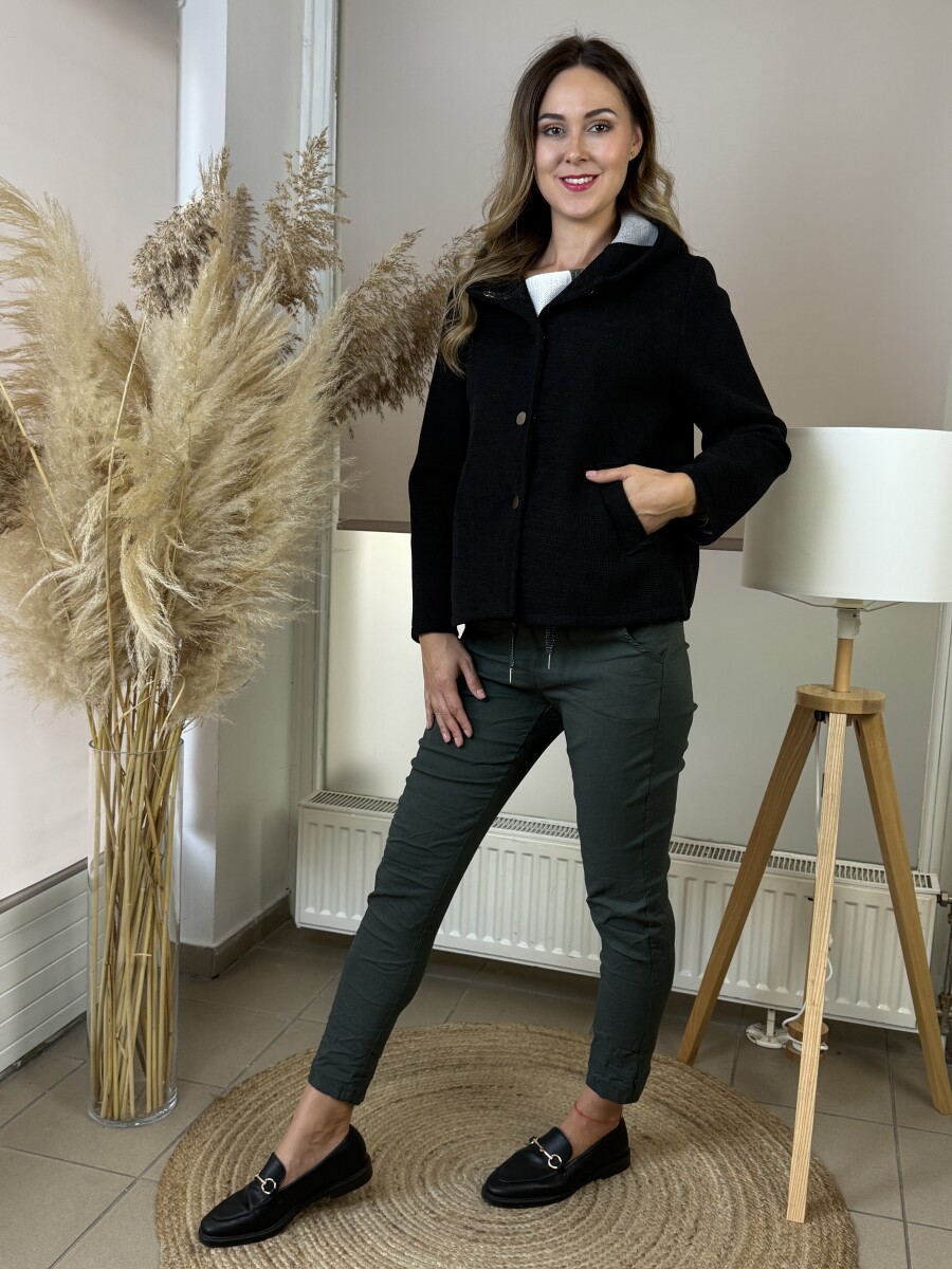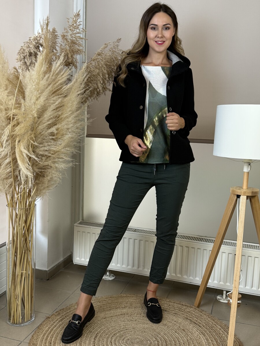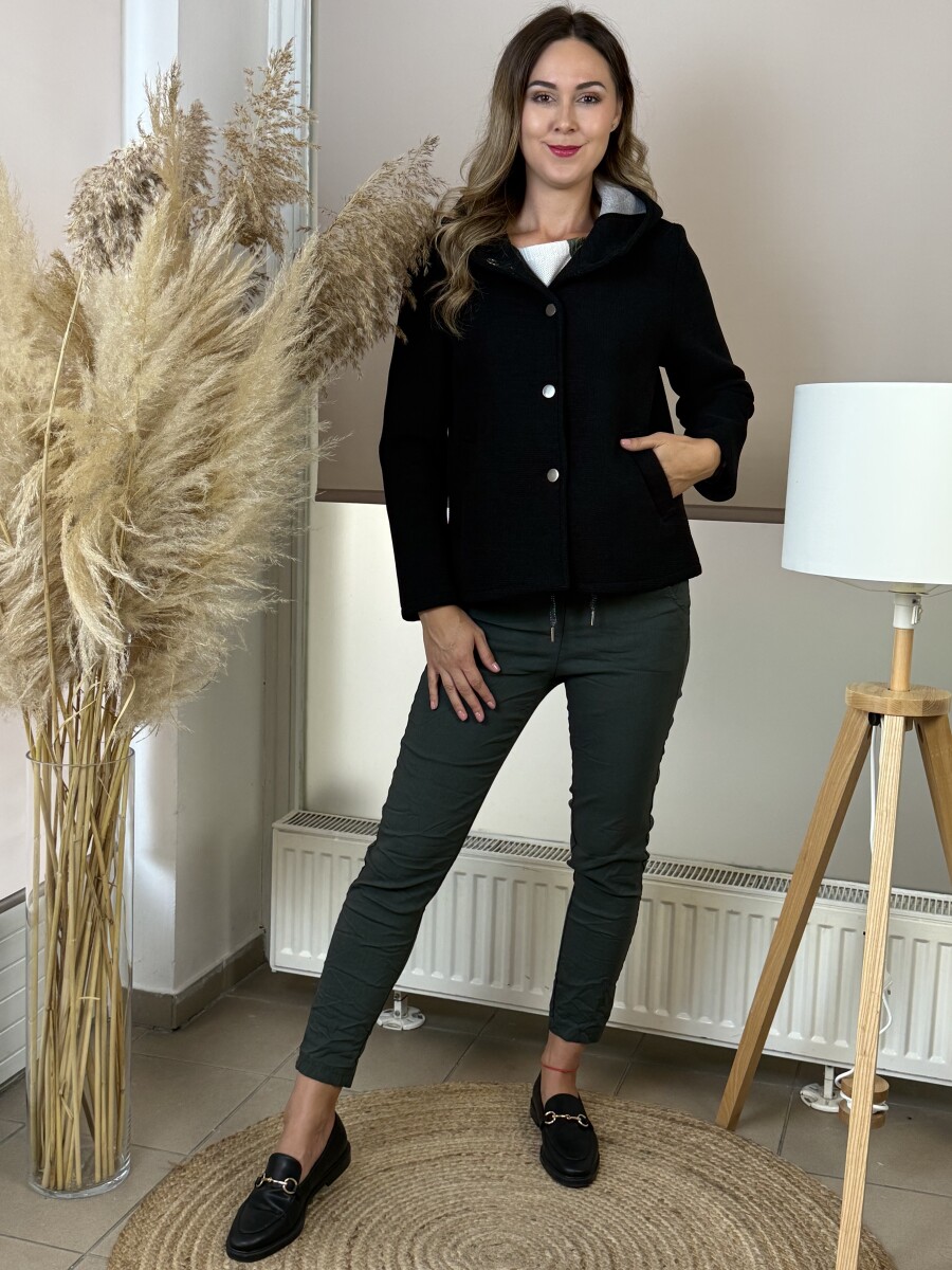 Egyenes rövid állású, bélés nélküli, kapucnis, elől két rejtett zsebes, patent gombos Őszi álmeneti szivacs kabát .