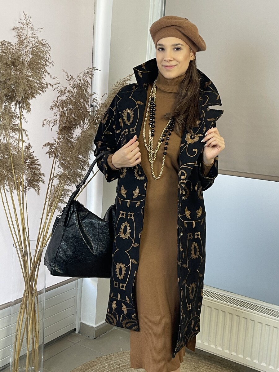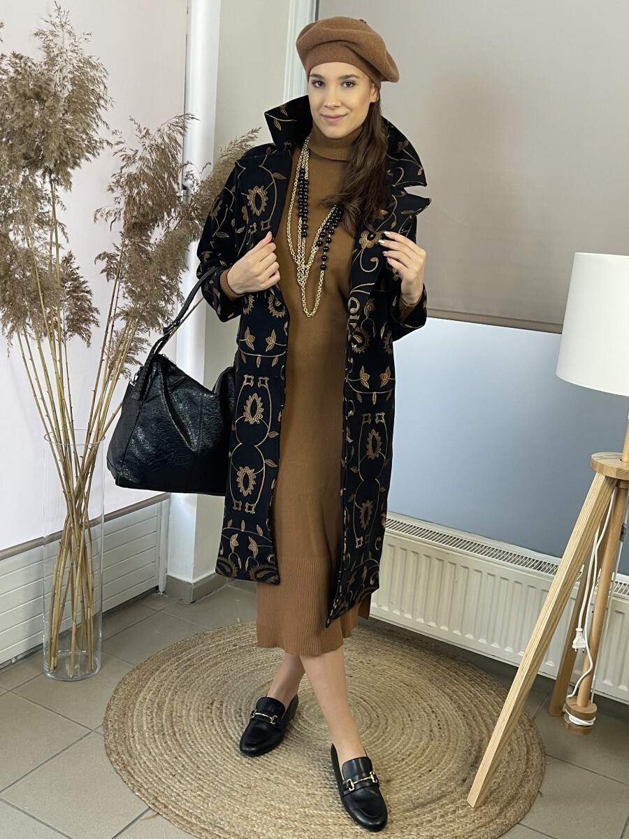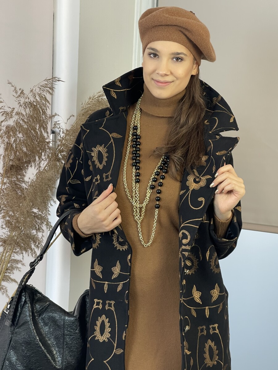 Vastag szövet anyagú, camel cérnával hímzett, hosszabb lezser fazonú, ejtett vállú, T ujjas, sálgalléros, elől két gombbal záródó, két oldalt vágott zsebes, selyem szerű béléses szövetkabát.