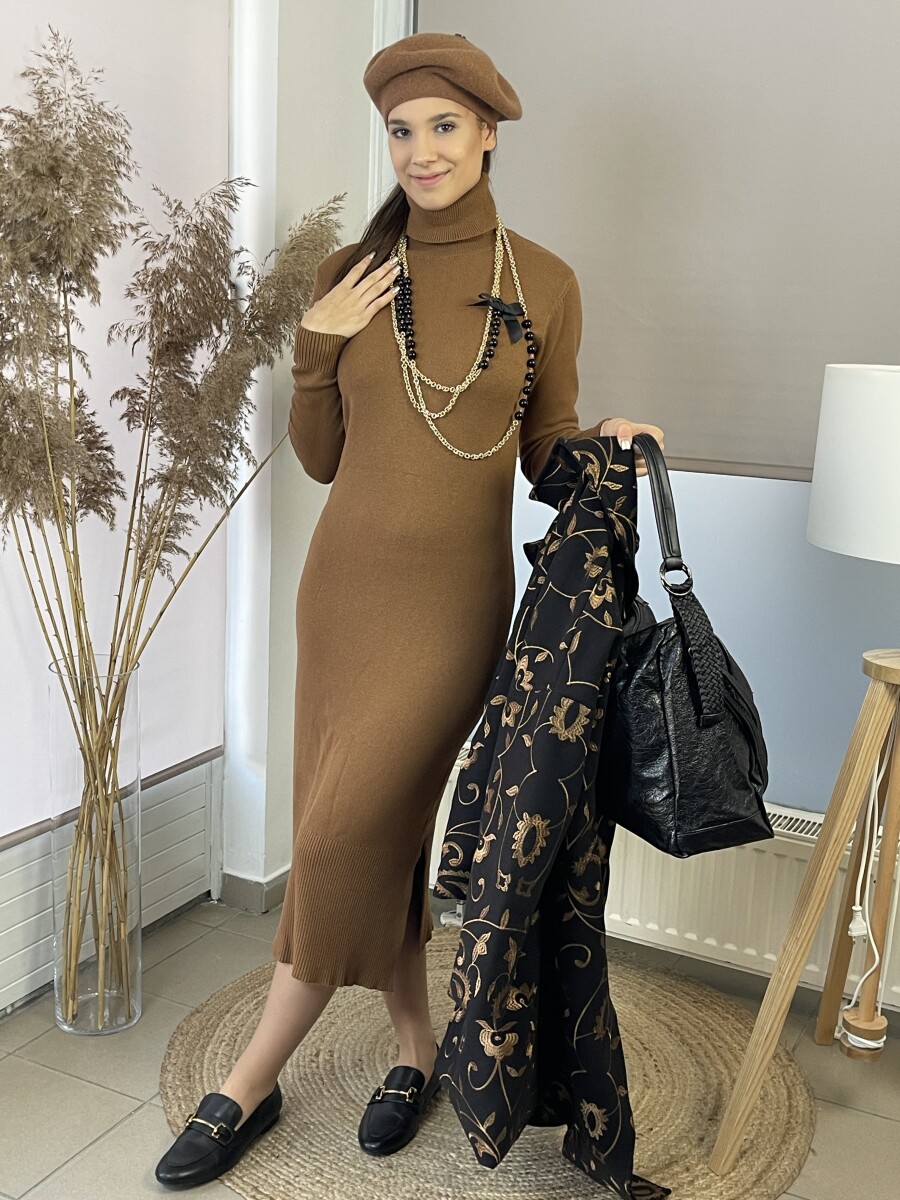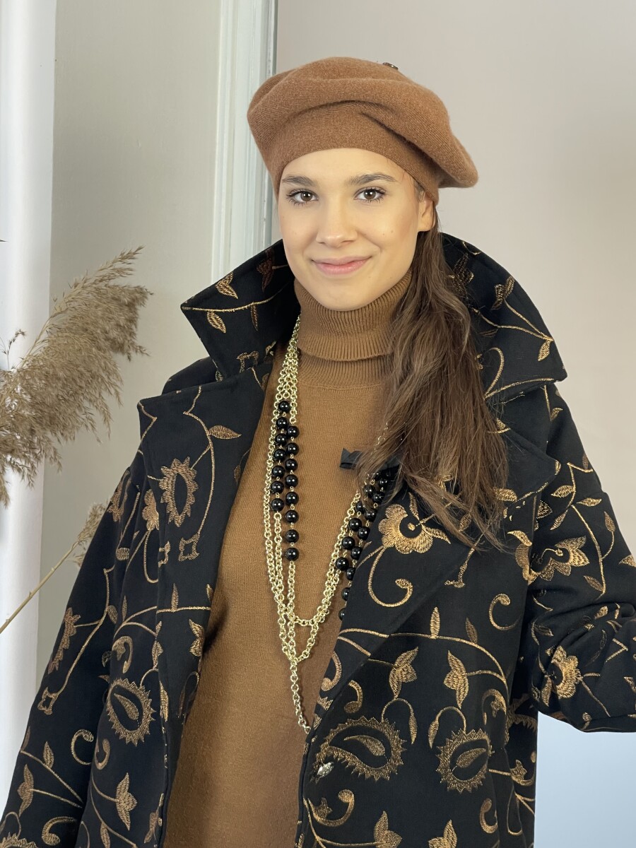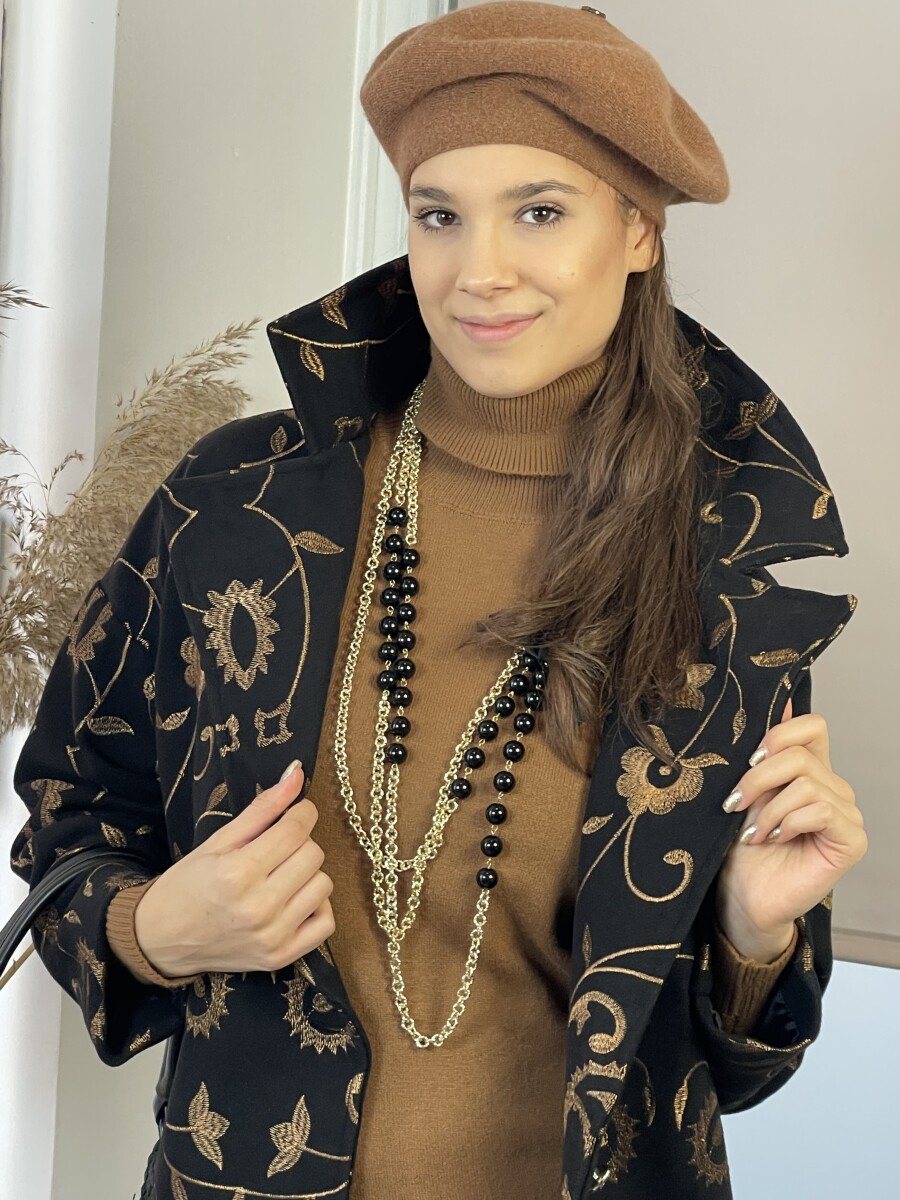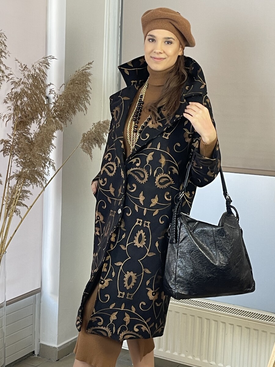 Vastag szövet anyagú, camel cérnával hímzett, hosszabb lezser fazonú, ejtett vállú, T ujjas, sálgalléros, elől két gombbal záródó, két oldalt vágott zsebes, selyem szerű béléses szövetkabát.