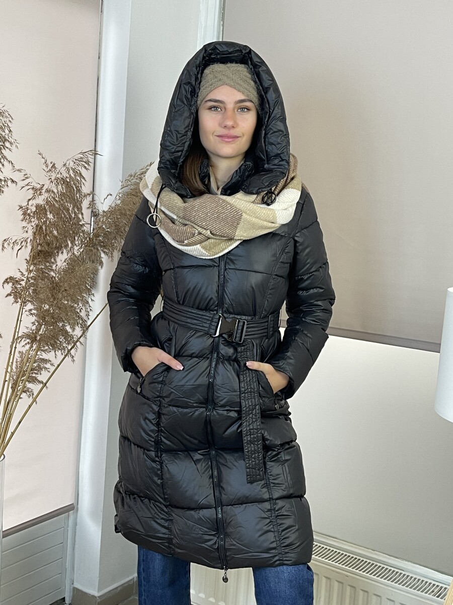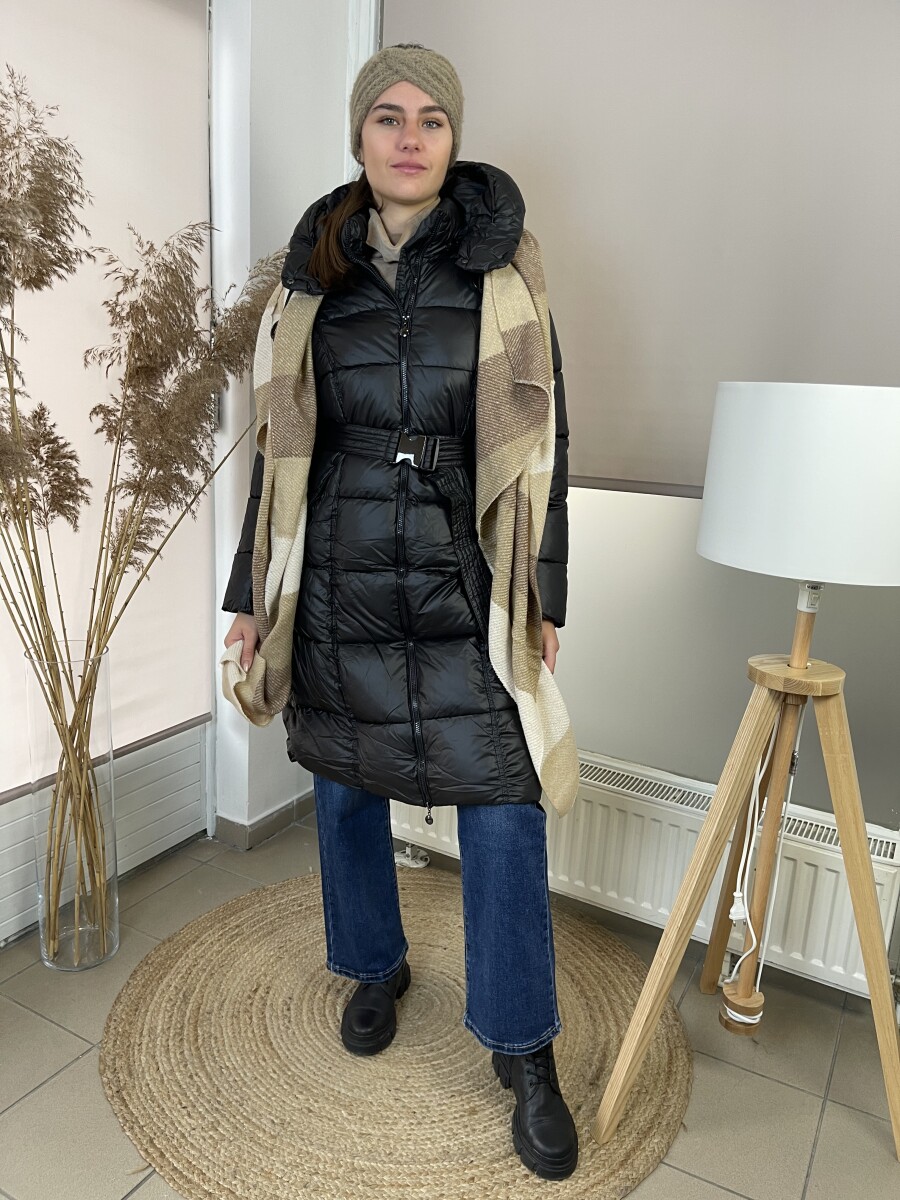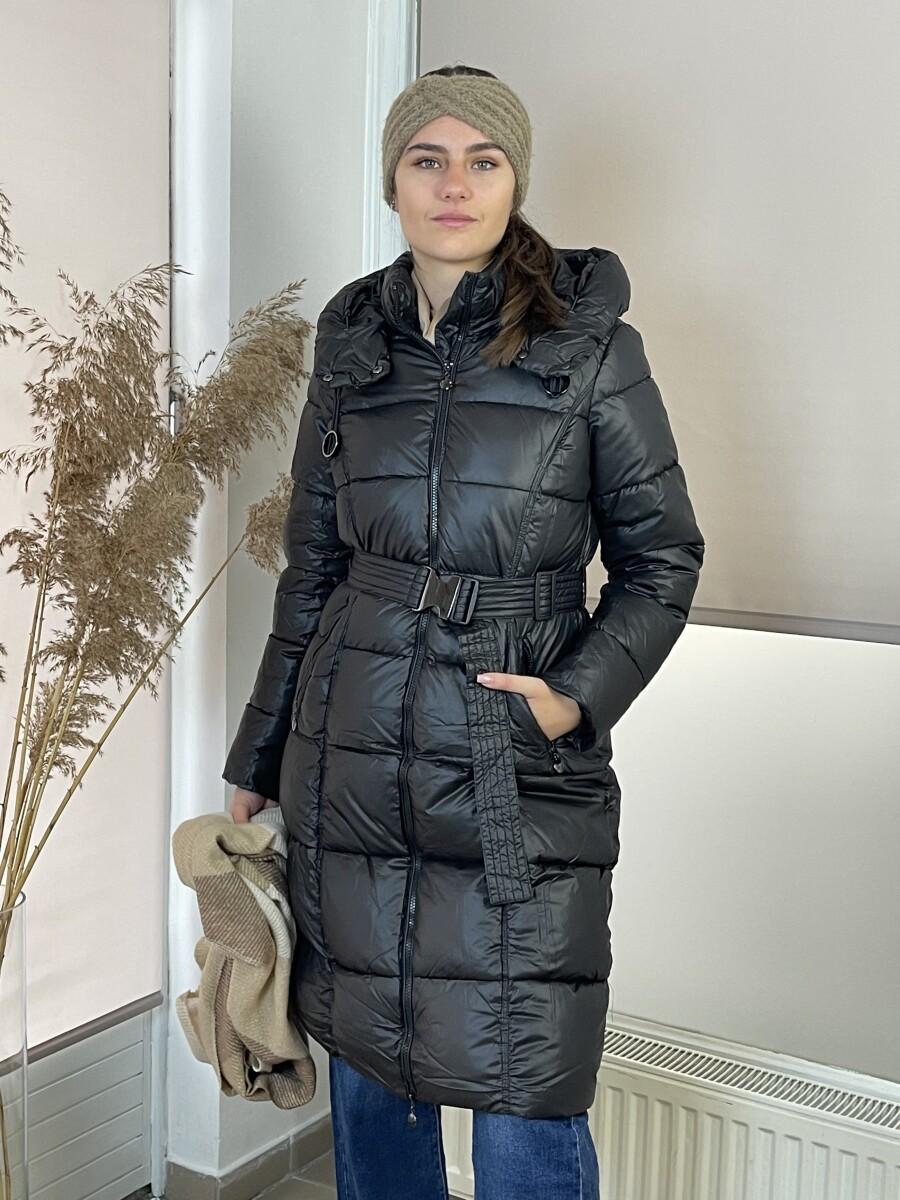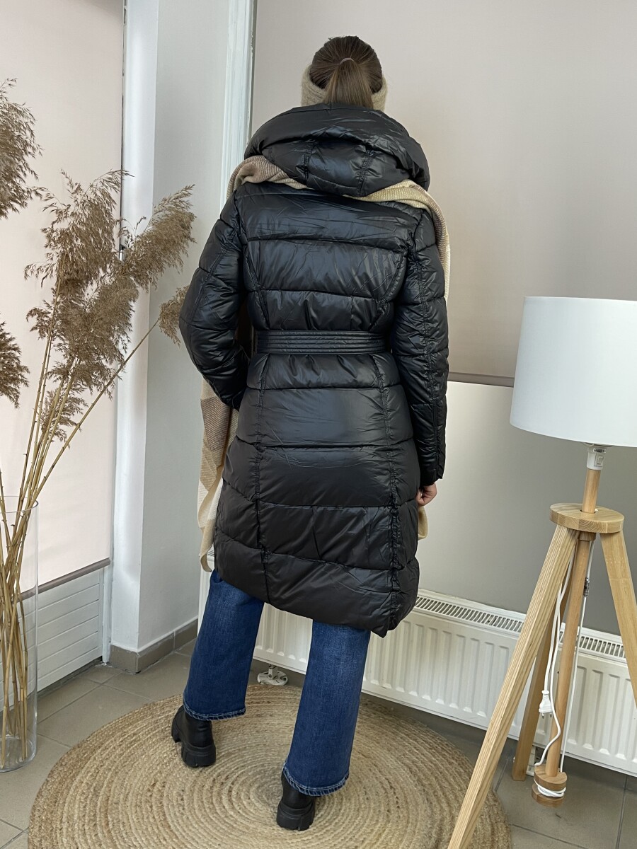 Karcsúsított fazonú, derekán állítható fém csatos öves, levehető kapucnis, selyem szerű béléses, vastagon bélelt, végig cipzáras, elöl két cipzáras zsebes steppelt női télikabát .