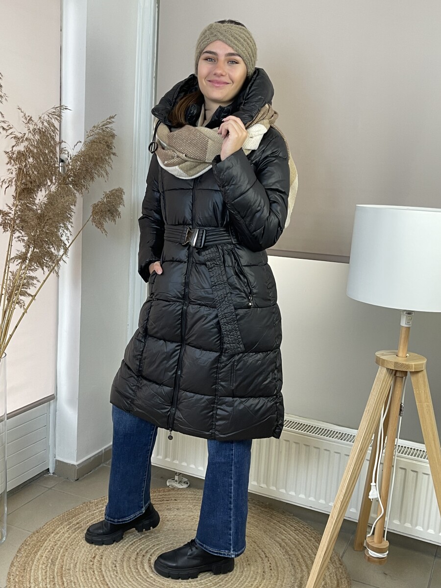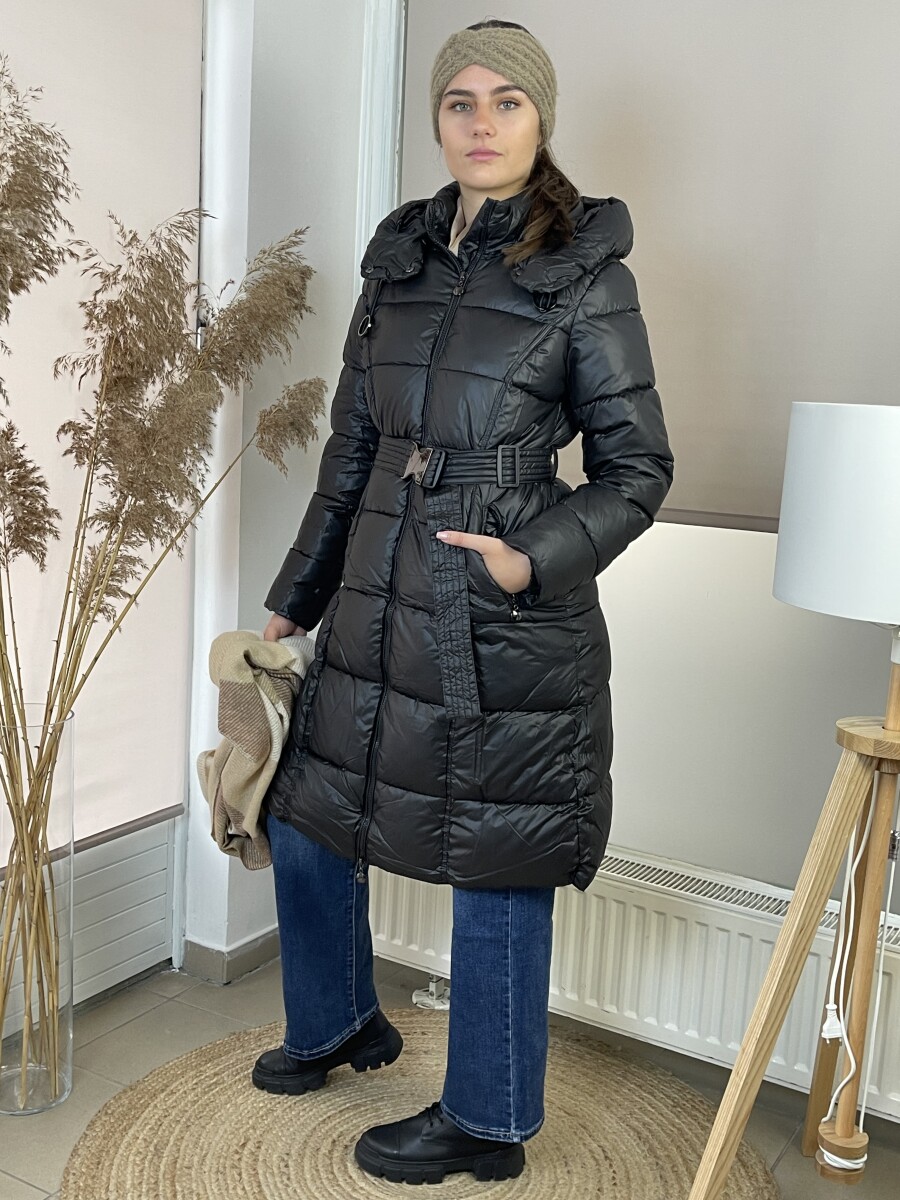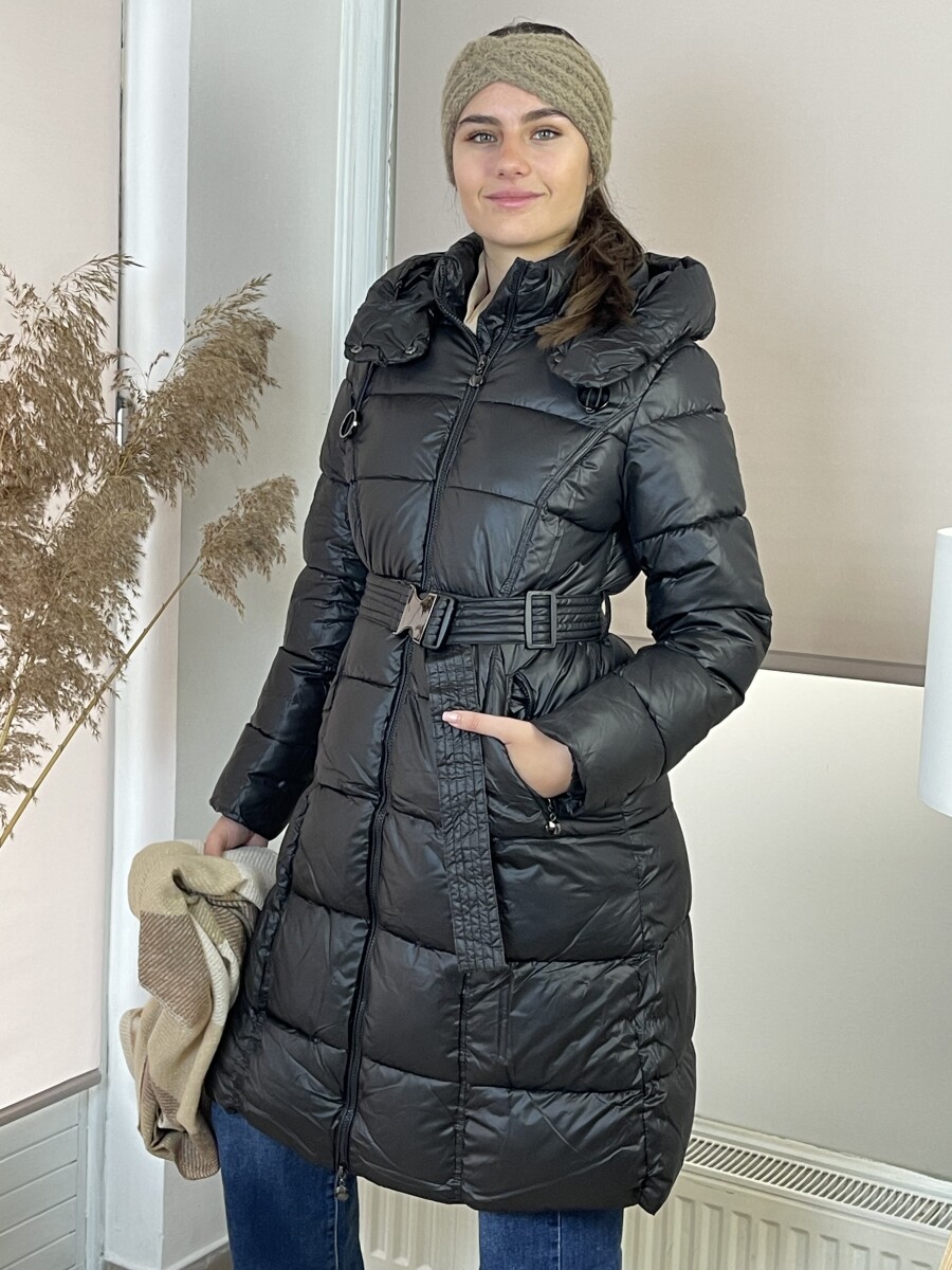 Karcsúsított fazonú, derekán állítható fém csatos öves, levehető kapucnis, selyem szerű béléses, vastagon bélelt, végig cipzáras, elöl két cipzáras zsebes steppelt női télikabát .