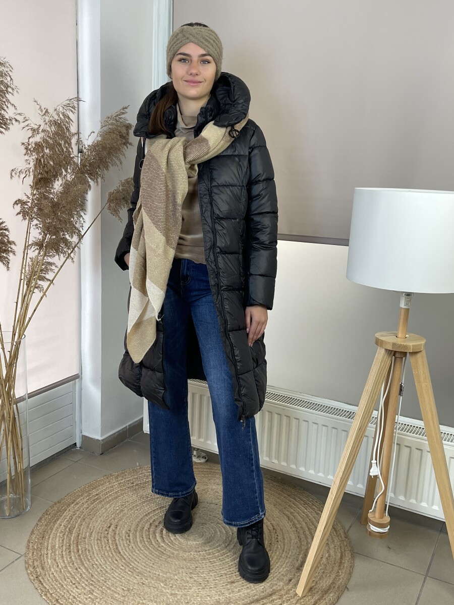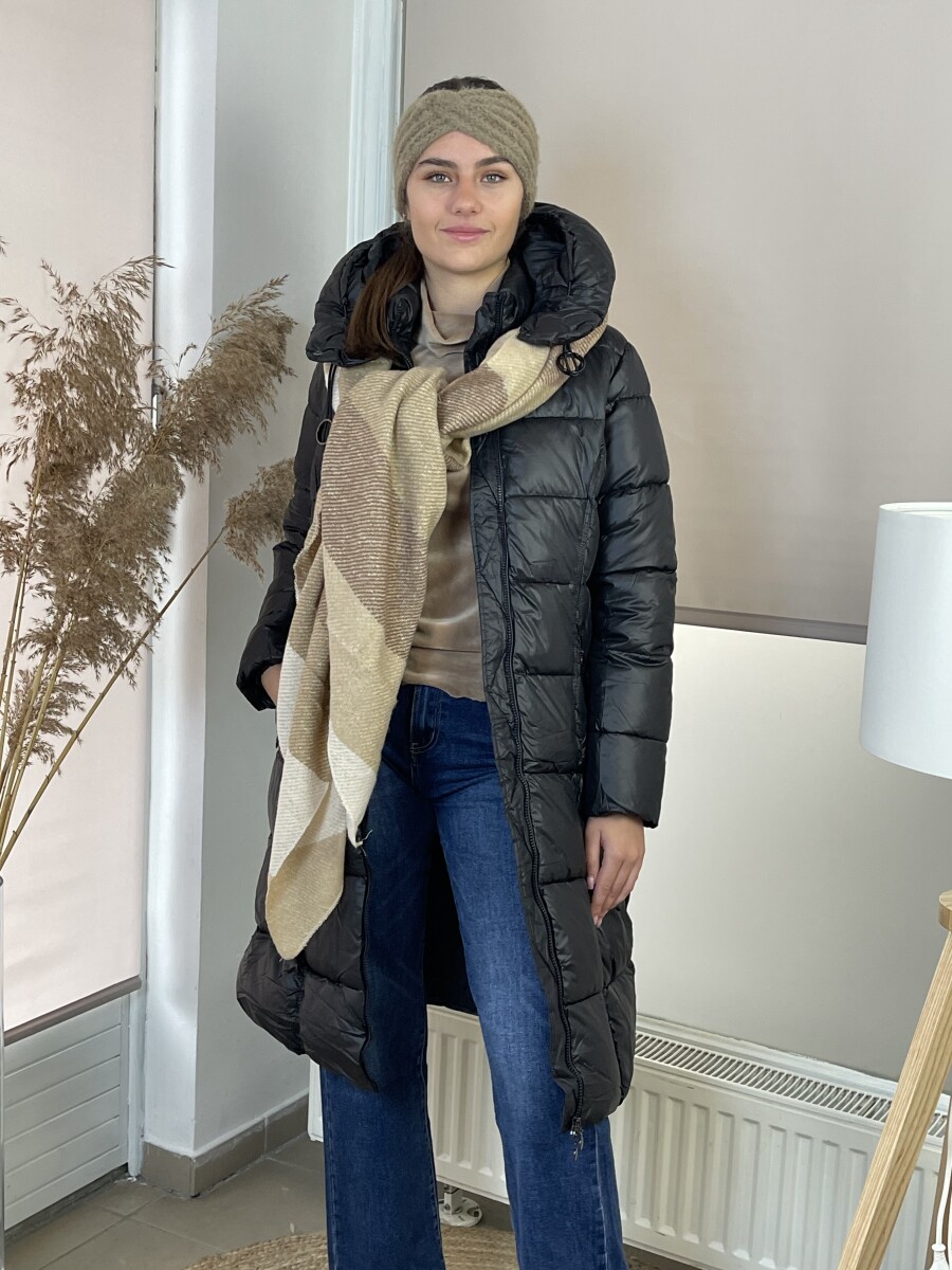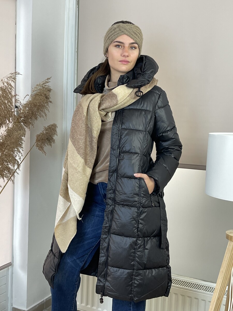 Karcsúsított fazonú, derekán állítható fém csatos öves, levehető kapucnis, selyem szerű béléses, vastagon bélelt, végig cipzáras, elöl két cipzáras zsebes steppelt női télikabát .