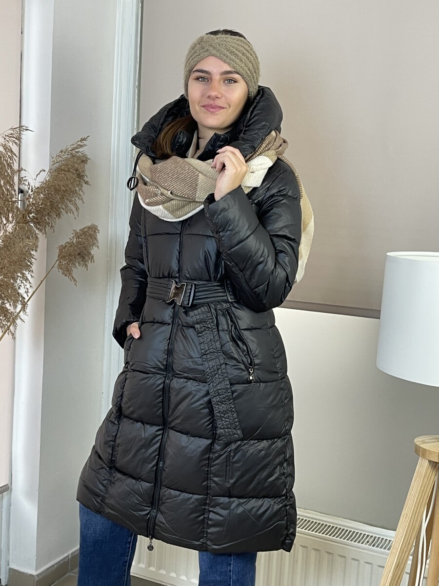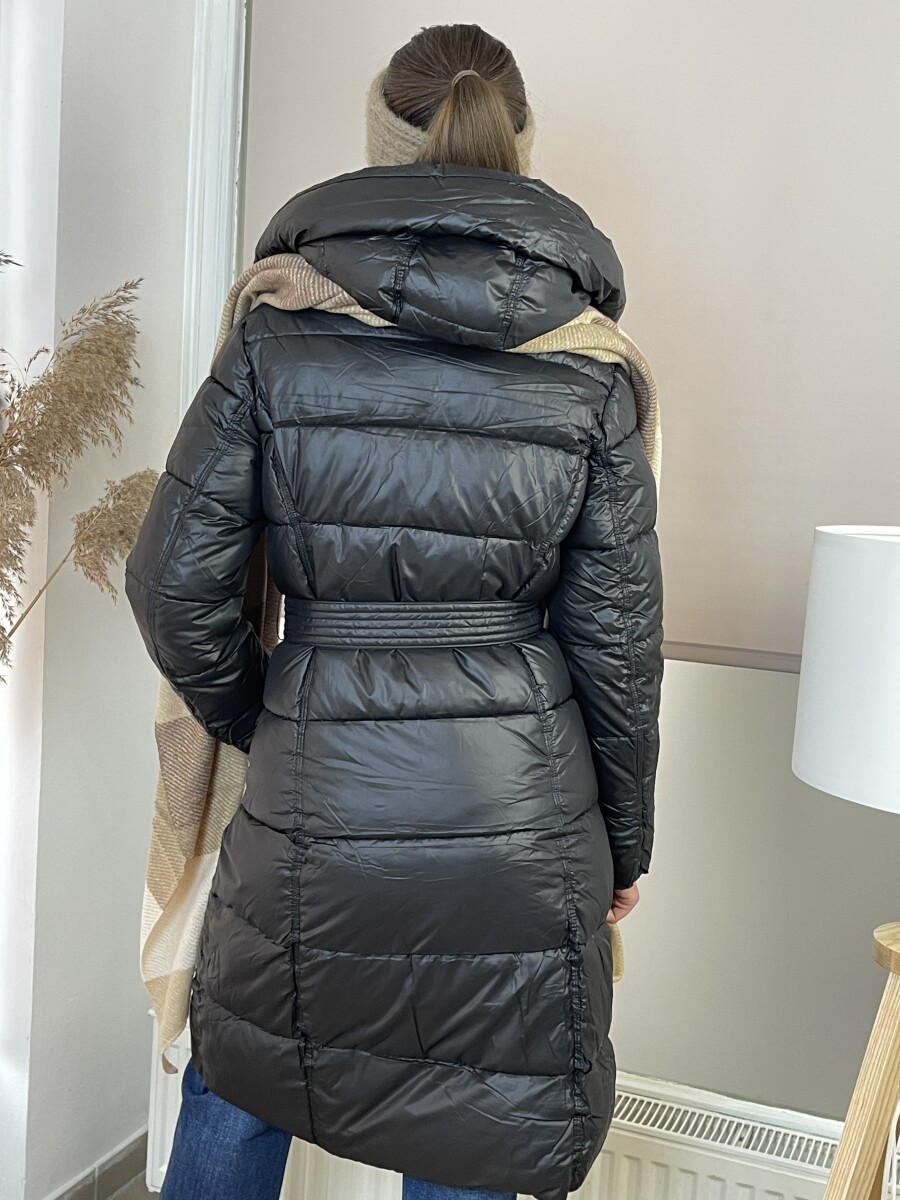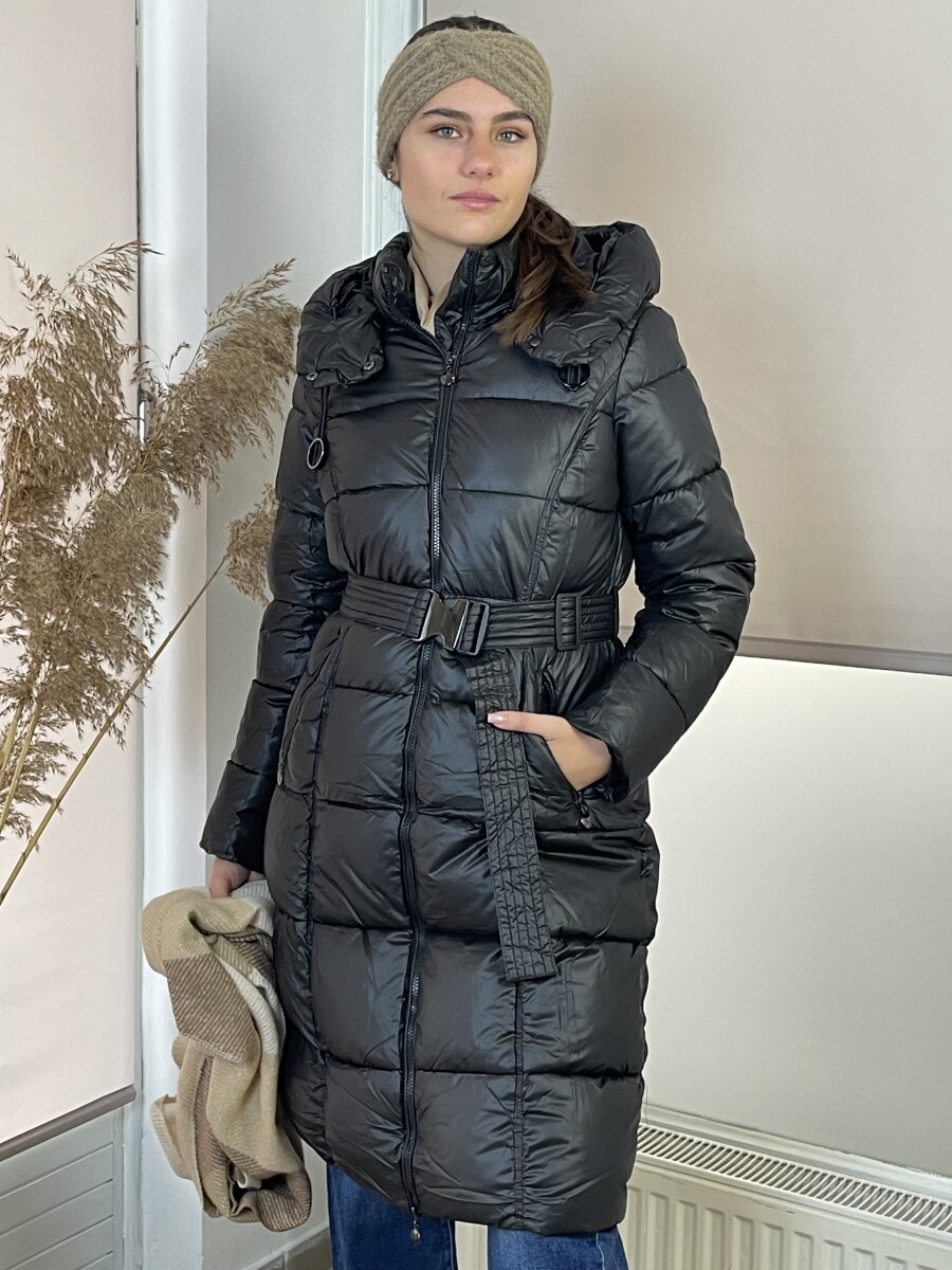 Karcsúsított fazonú, derekán állítható fém csatos öves, levehető kapucnis, selyem szerű béléses, vastagon bélelt, végig cipzáras, elöl két cipzáras zsebes steppelt női télikabát .