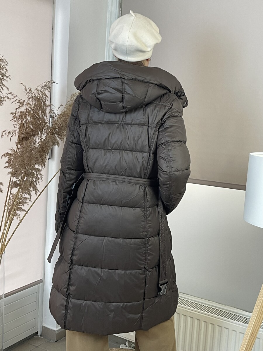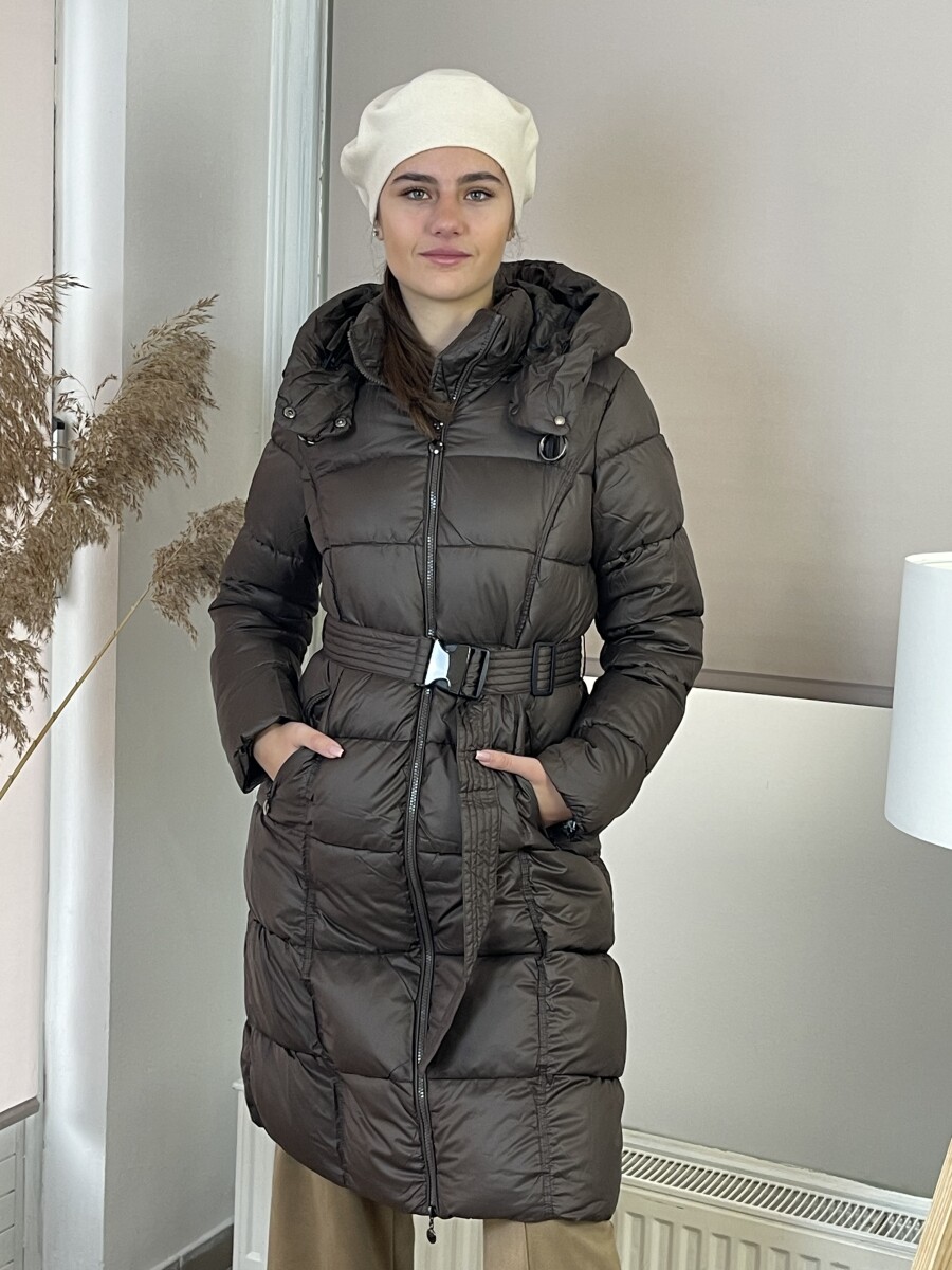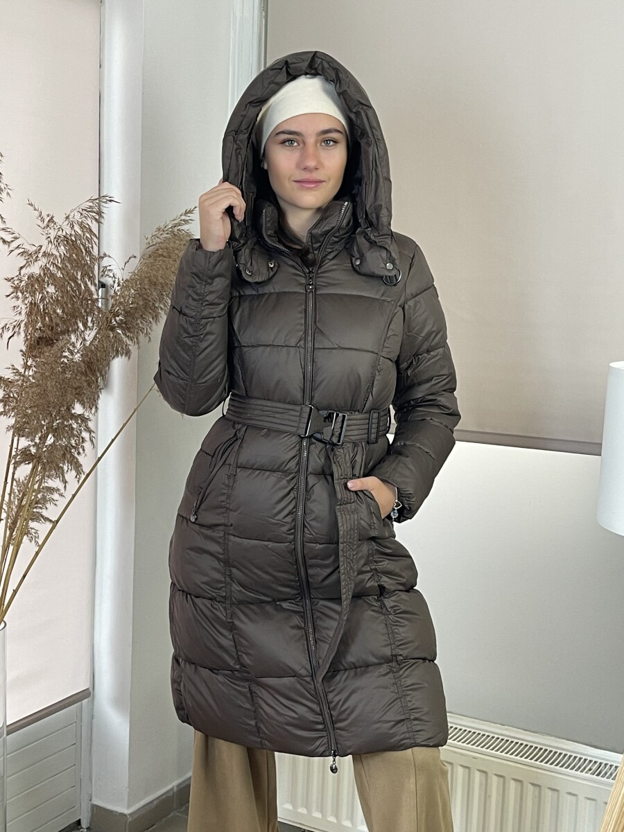 Karcsúsított fazonú, derekán állítható fém csatos öves, levehető kapucnis, selyem szerű béléses, vastagon bélelt, végig cipzáras, elöl két cipzáras zsebes steppelt női télikabát .