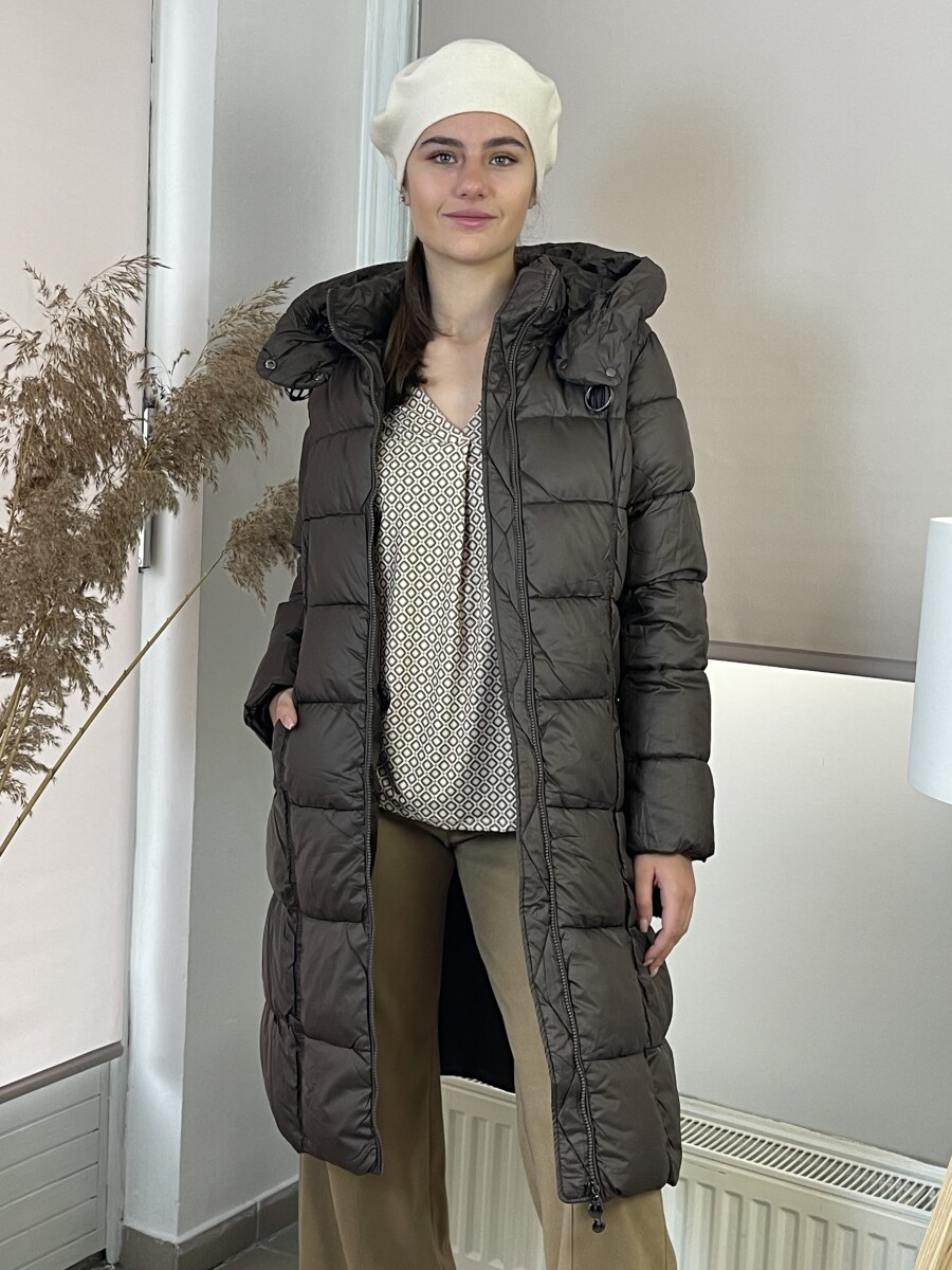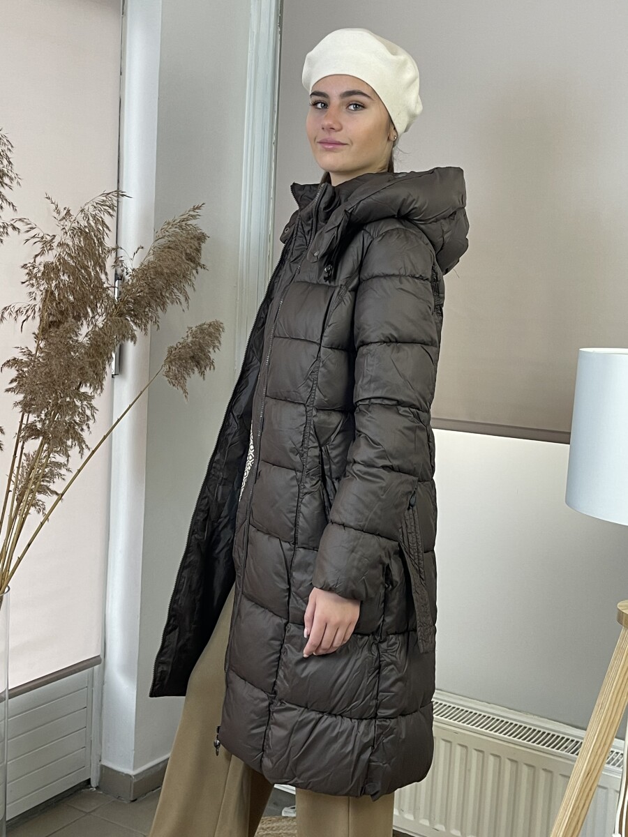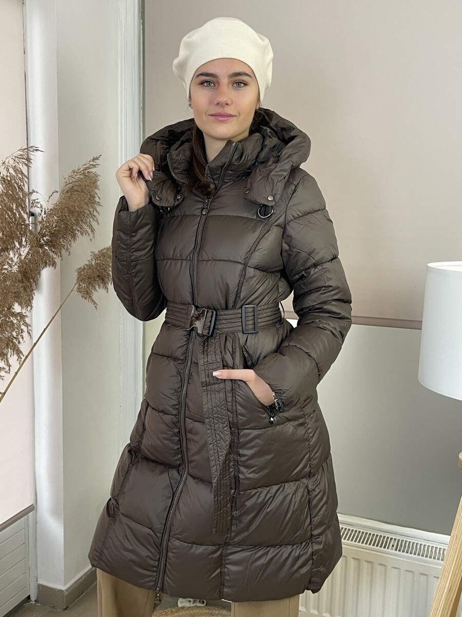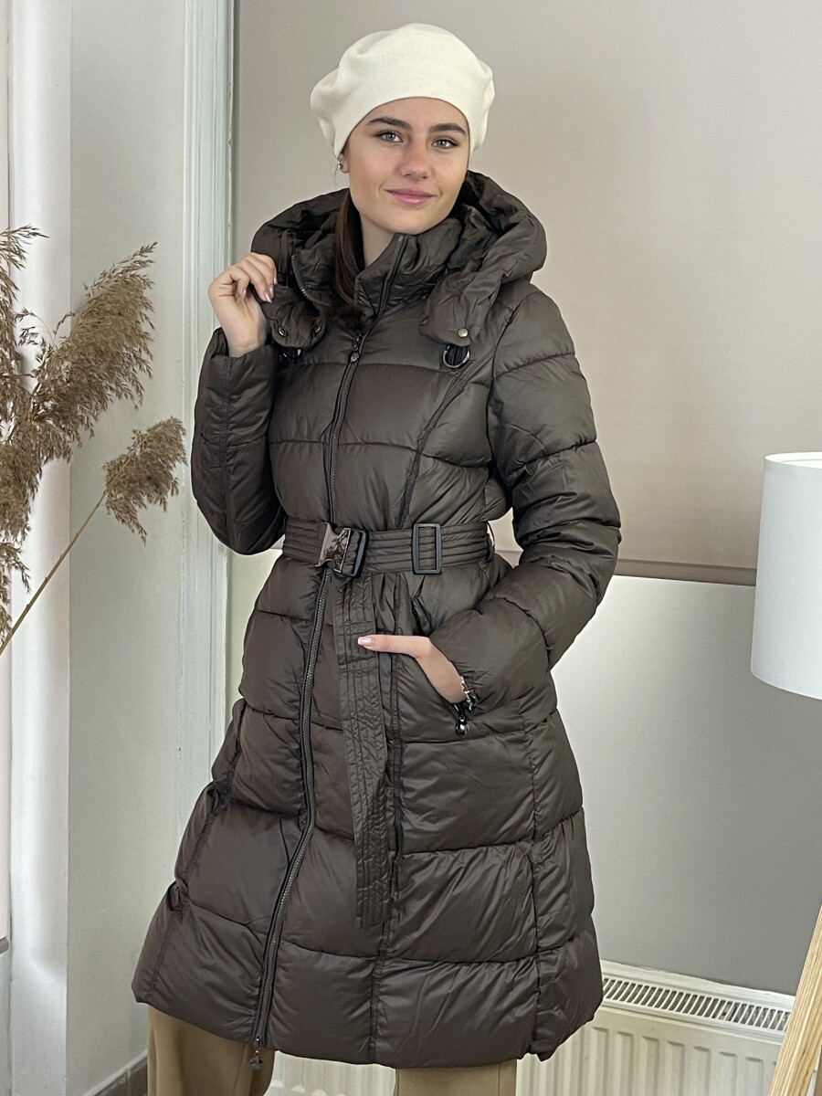 Karcsúsított fazonú, derekán állítható fém csatos öves, levehető kapucnis, selyem szerű béléses, vastagon bélelt, végig cipzáras, elöl két cipzáras zsebes steppelt női télikabát .