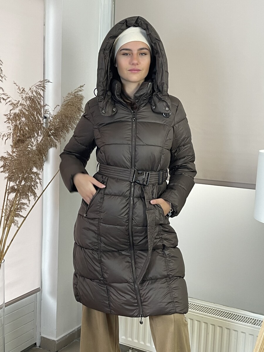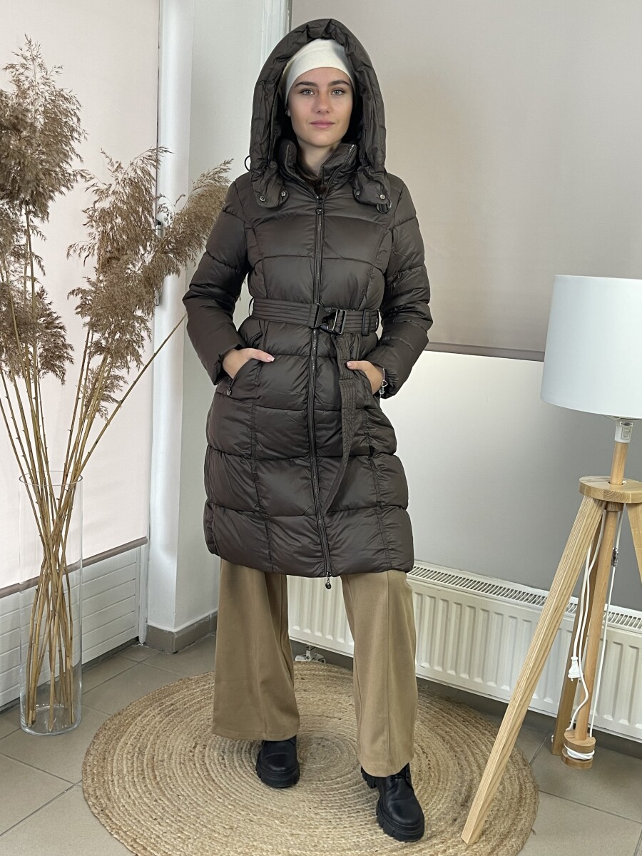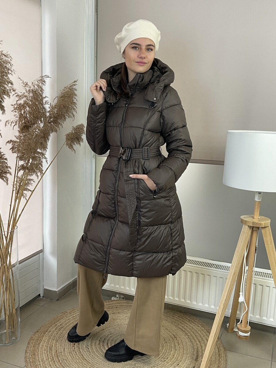 Karcsúsított fazonú, derekán állítható fém csatos öves, levehető kapucnis, selyem szerű béléses, vastagon bélelt, végig cipzáras, elöl két cipzáras zsebes steppelt női télikabát .