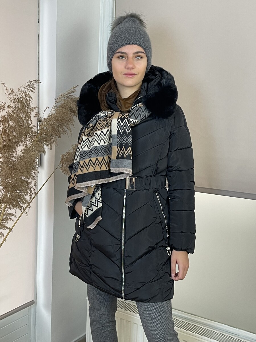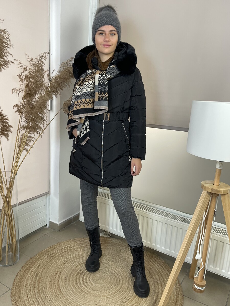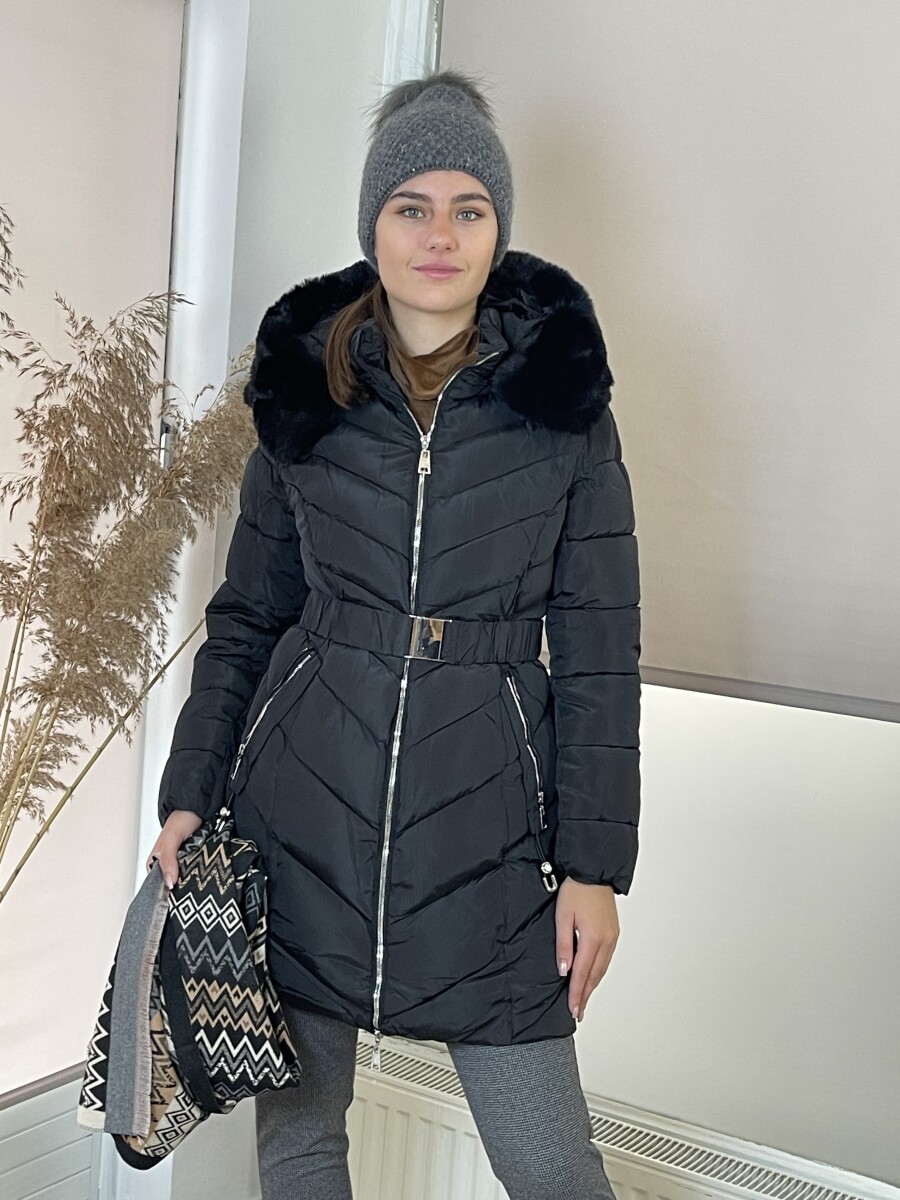 Karcsúsított fazonú, derekán rugalmas gumis fém csatos öves, levehető szőrmés kapucnis, (szőrme külön legombolható), selyem szerű béléses, vastagon bélelt, steppelt női télikabát .