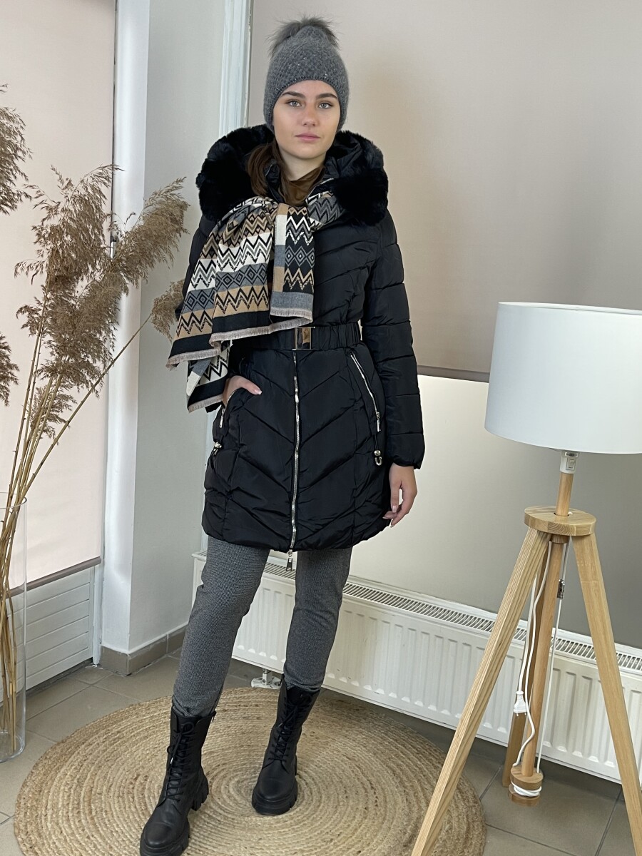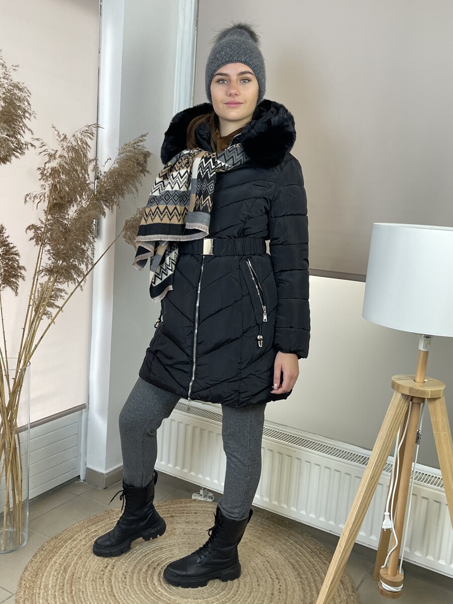 Karcsúsított fazonú, derekán rugalmas gumis fém csatos öves, levehető szőrmés kapucnis, (szőrme külön legombolható), selyem szerű béléses, vastagon bélelt, steppelt női télikabát .