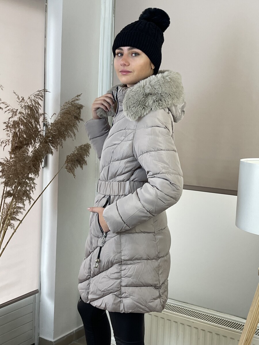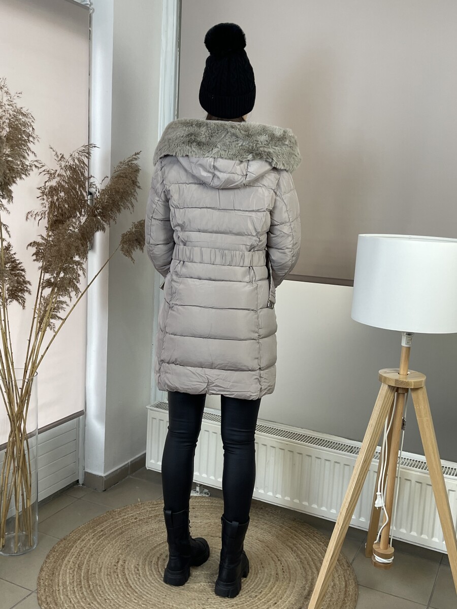 Karcsúsított fazonú, derekán rugalmas gumis fém csatos öves, levehető szőrmés kapucnis, (szőrme külön legombolható), selyem szerű béléses, vastagon bélelt, steppelt női télikabát .