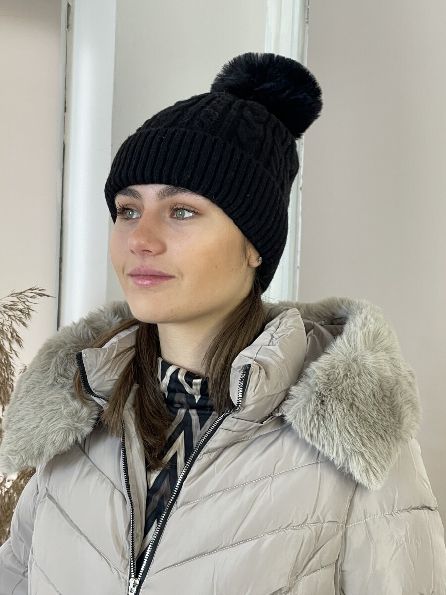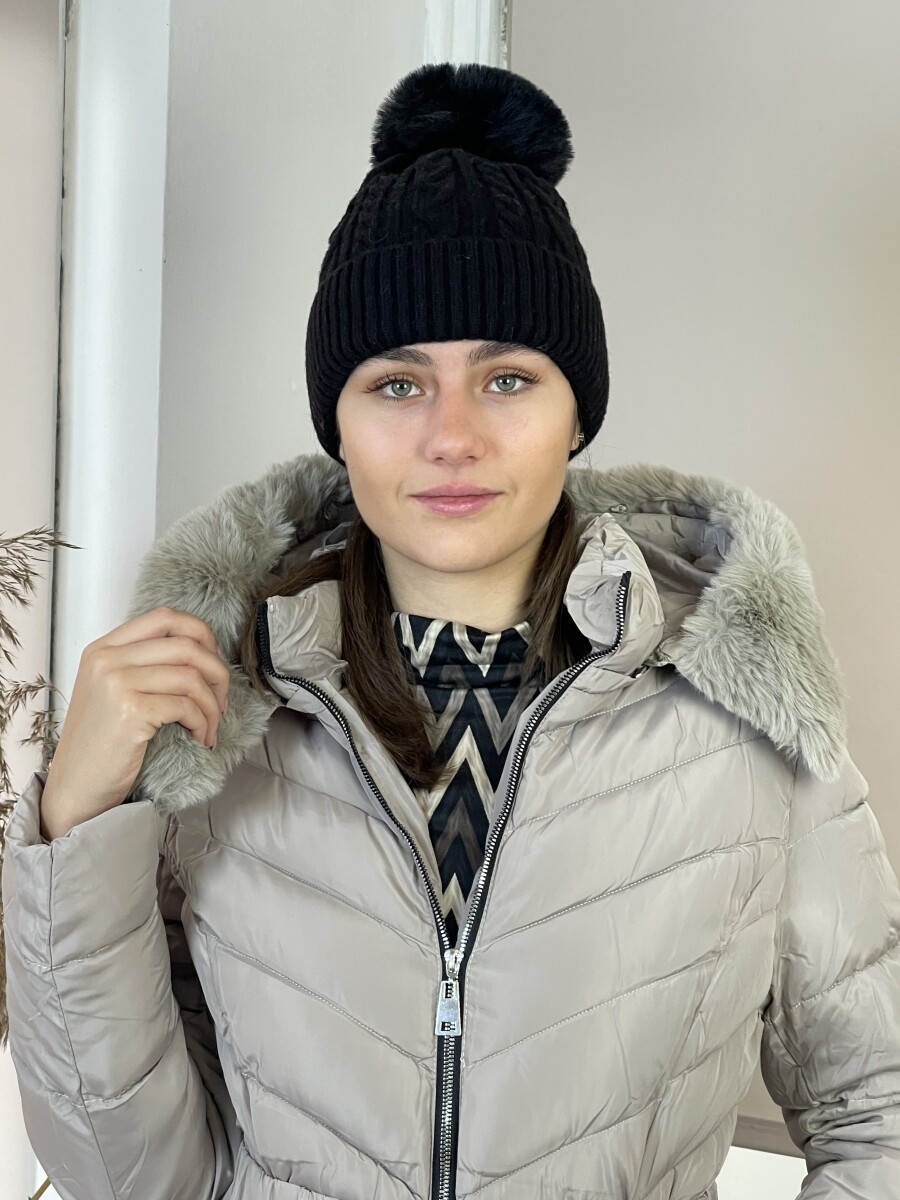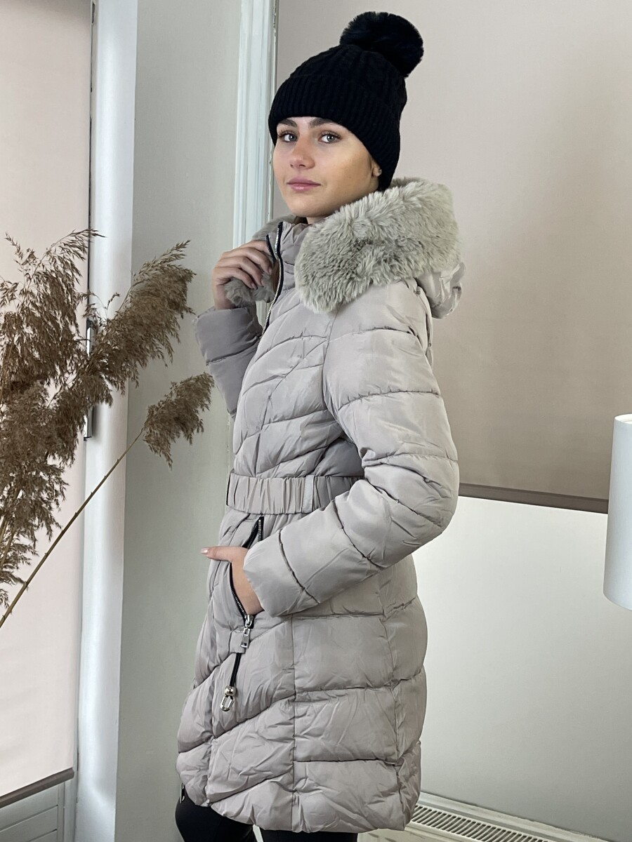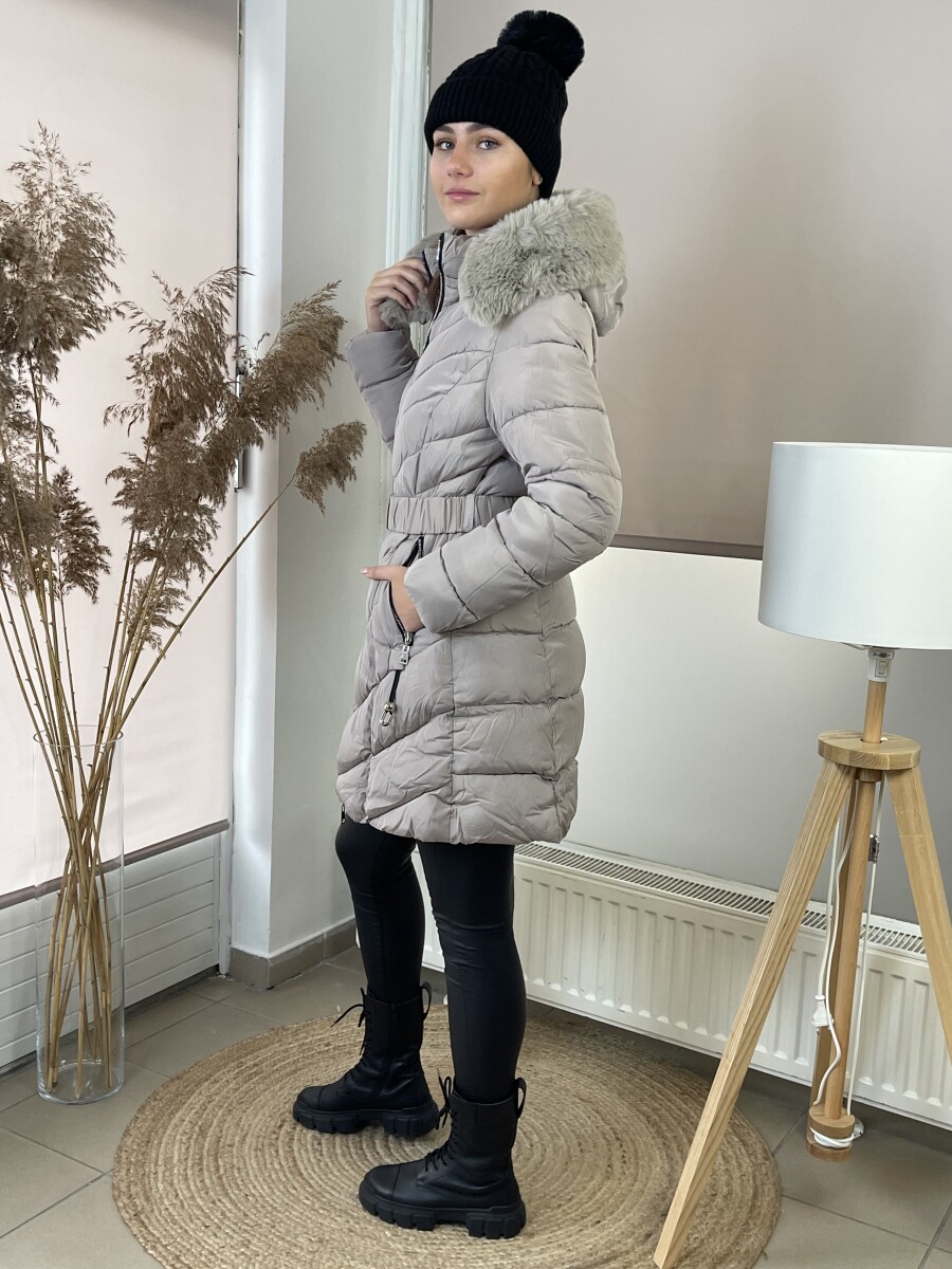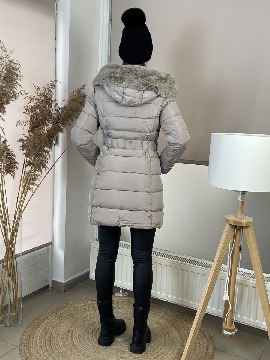Karcsúsított fazonú, derekán rugalmas gumis fém csatos öves, levehető szőrmés kapucnis, (szőrme külön legombolható), selyem szerű béléses, vastagon bélelt, steppelt női télikabát .