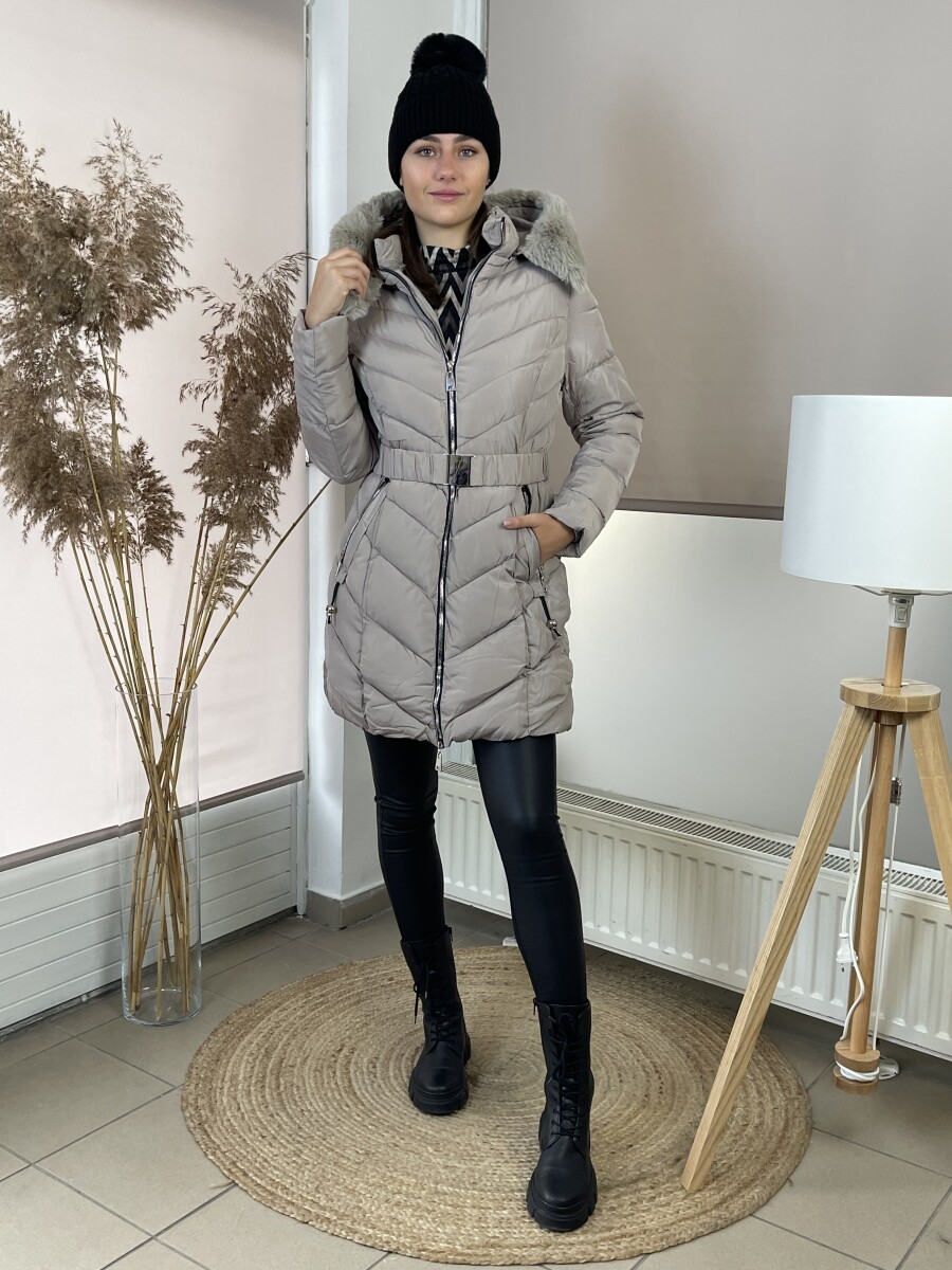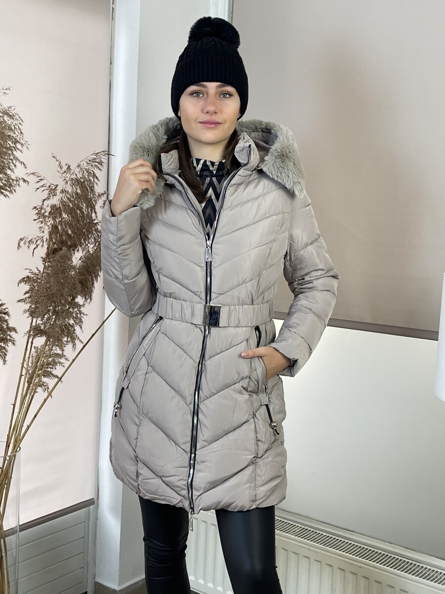 Karcsúsított fazonú, derekán rugalmas gumis fém csatos öves, levehető szőrmés kapucnis, (szőrme külön legombolható), selyem szerű béléses, vastagon bélelt, steppelt női télikabát .