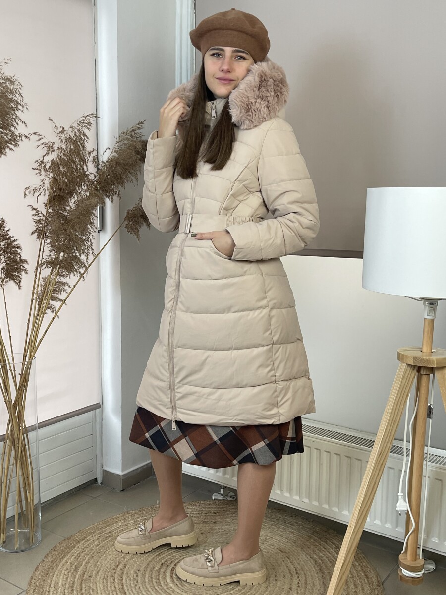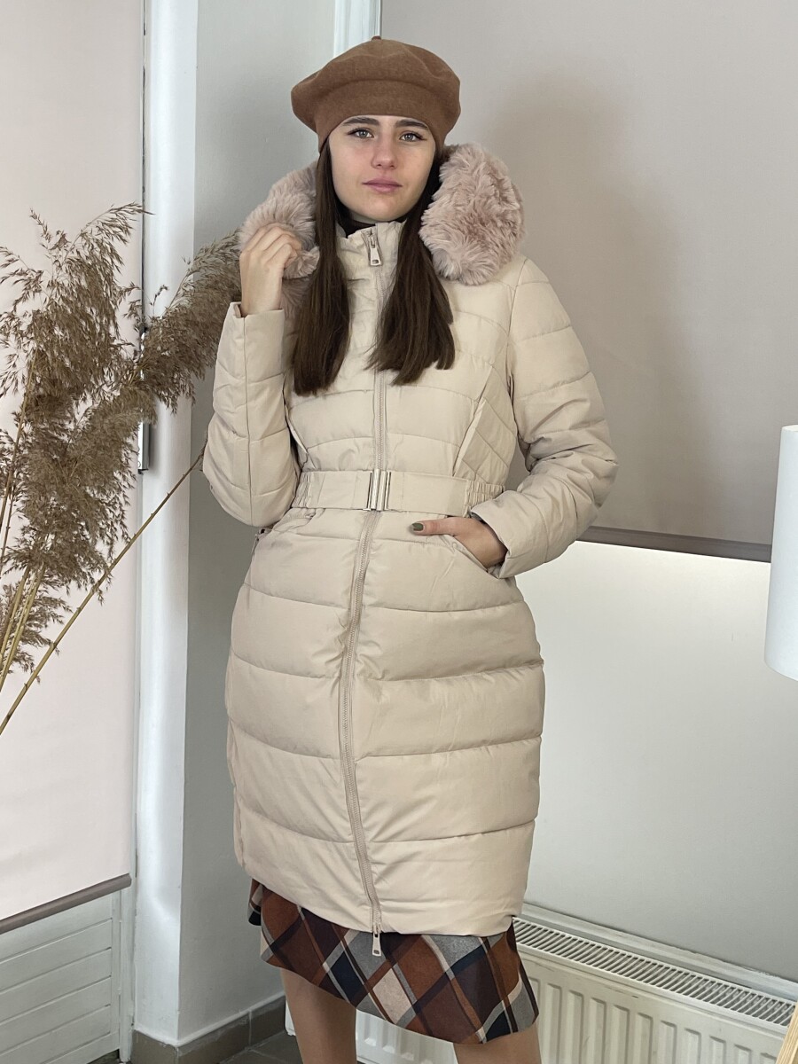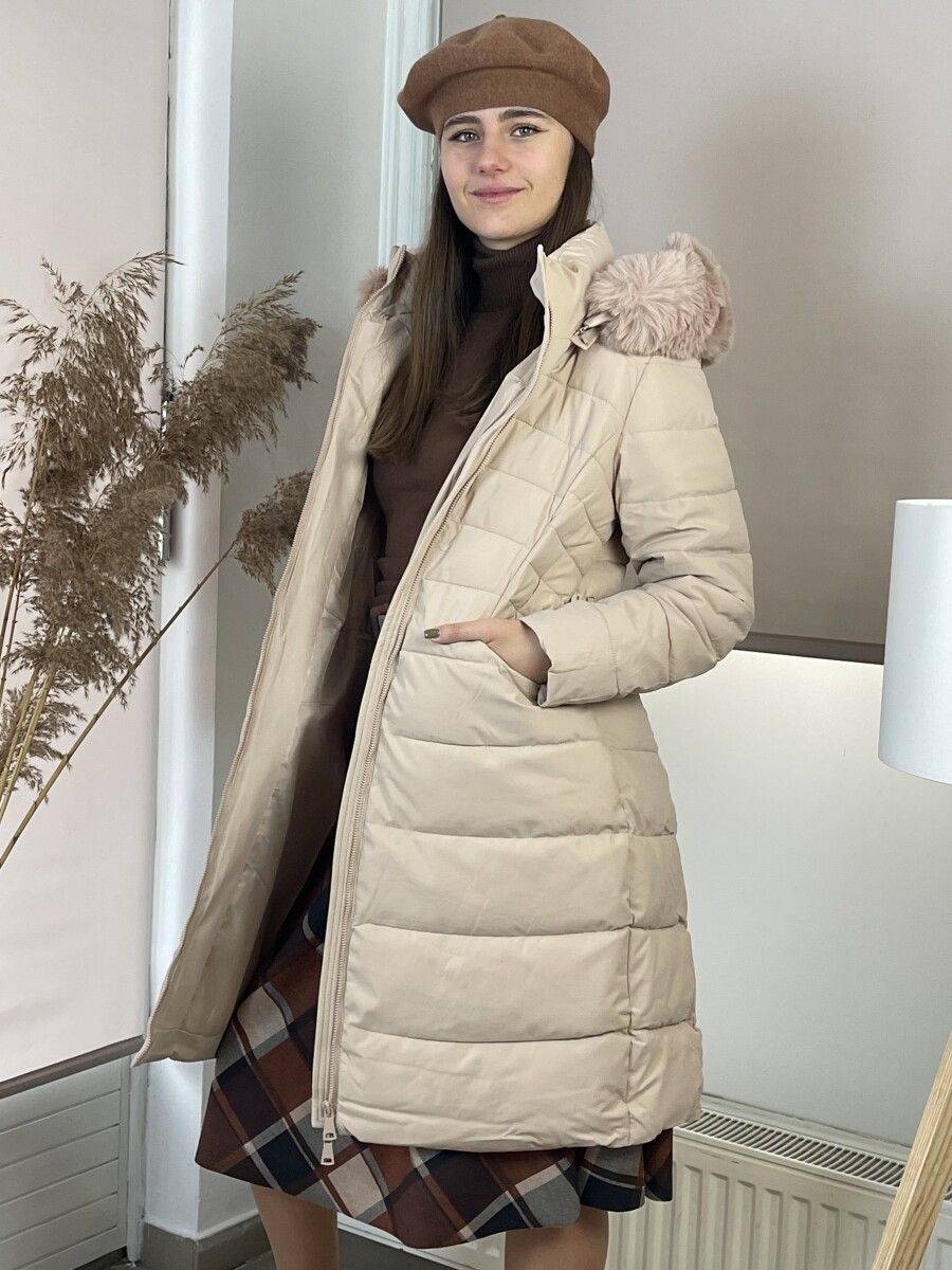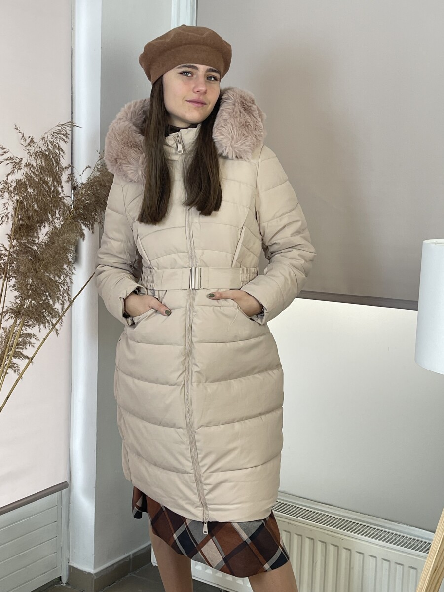 Karcsúsított fazonú, derekán rugalmas gumis fém csatos öves, levehető szőrmés kapucnis, (szőrme külön legombolható), selyem szerű béléses, vastagon bélelt, steppelt női hosszú télikabát .