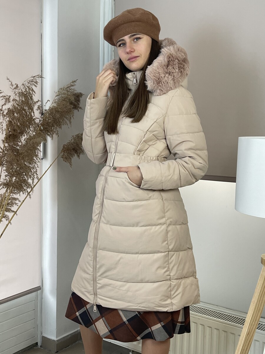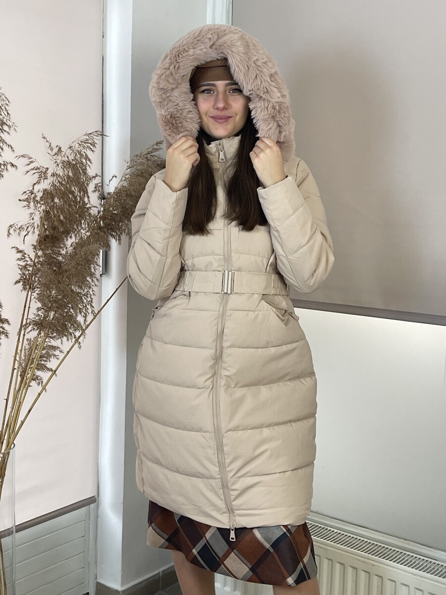 Karcsúsított fazonú, derekán rugalmas gumis fém csatos öves, levehető szőrmés kapucnis, (szőrme külön legombolható), selyem szerű béléses, vastagon bélelt, steppelt női hosszú télikabát .
