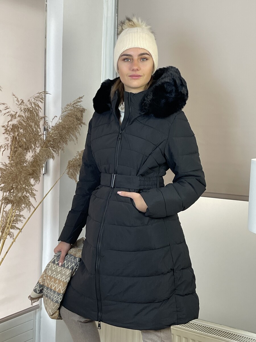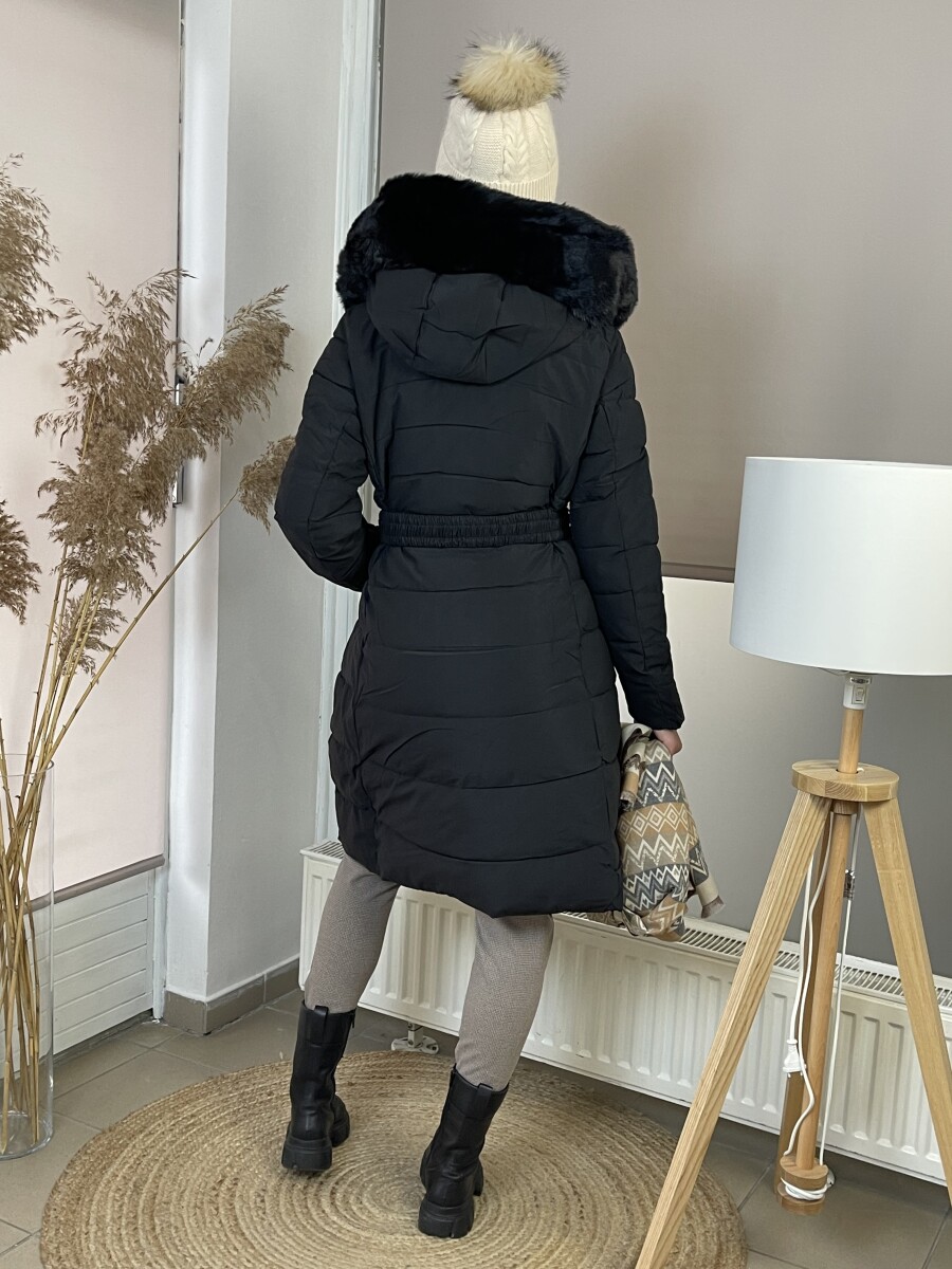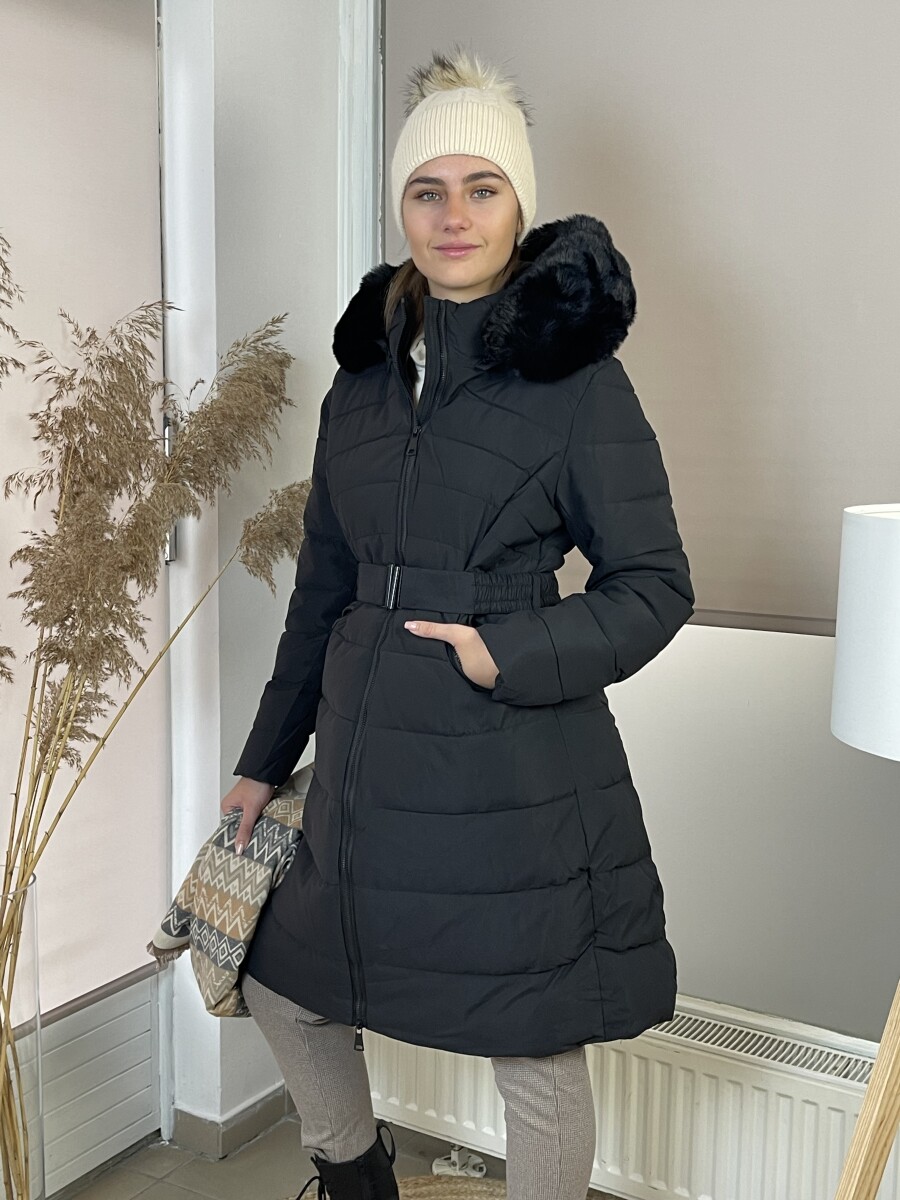 Karcsúsított fazonú, derekán rugalmas gumis fém csatos öves, levehető szőrmés kapucnis, (szőrme külön legombolható), selyem szerű béléses, vastagon bélelt, steppelt női hosszú télikabát .