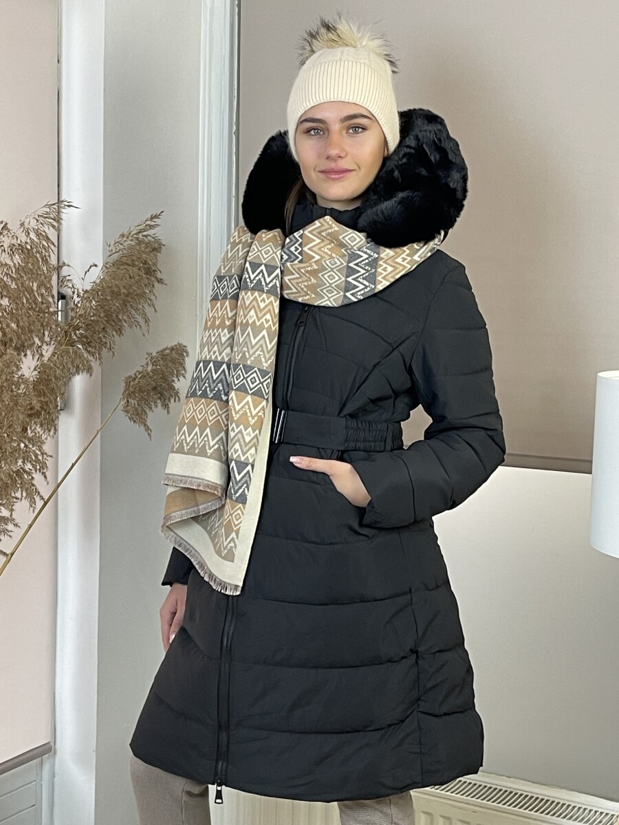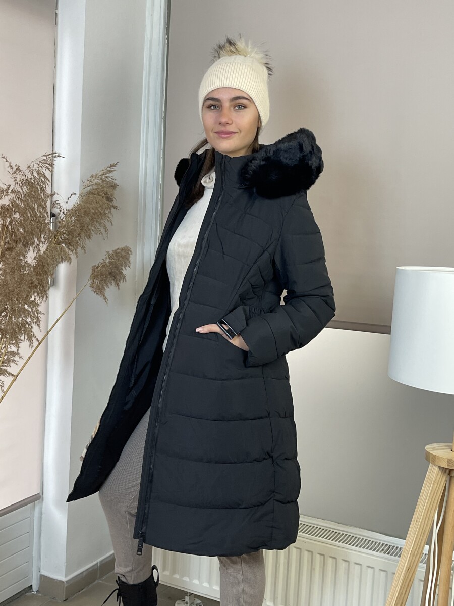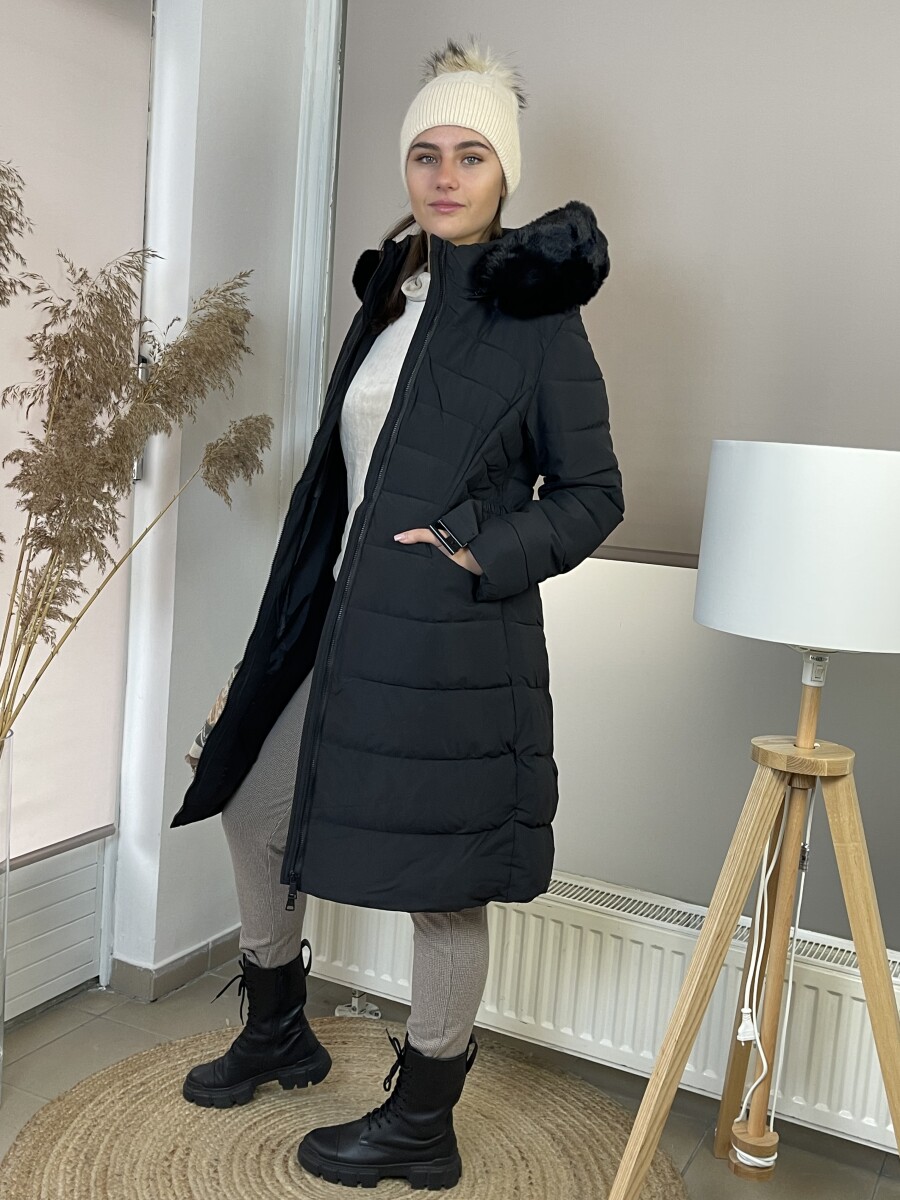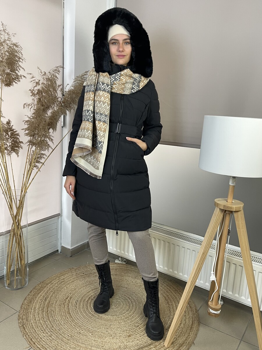 Karcsúsított fazonú, derekán rugalmas gumis fém csatos öves, levehető szőrmés kapucnis, (szőrme külön legombolható), selyem szerű béléses, vastagon bélelt, steppelt női hosszú télikabát .