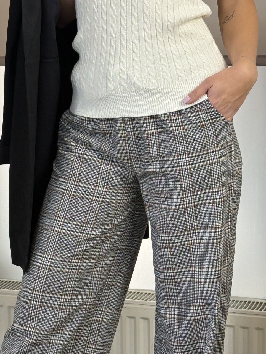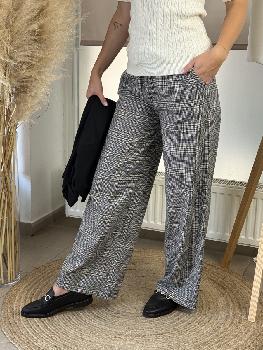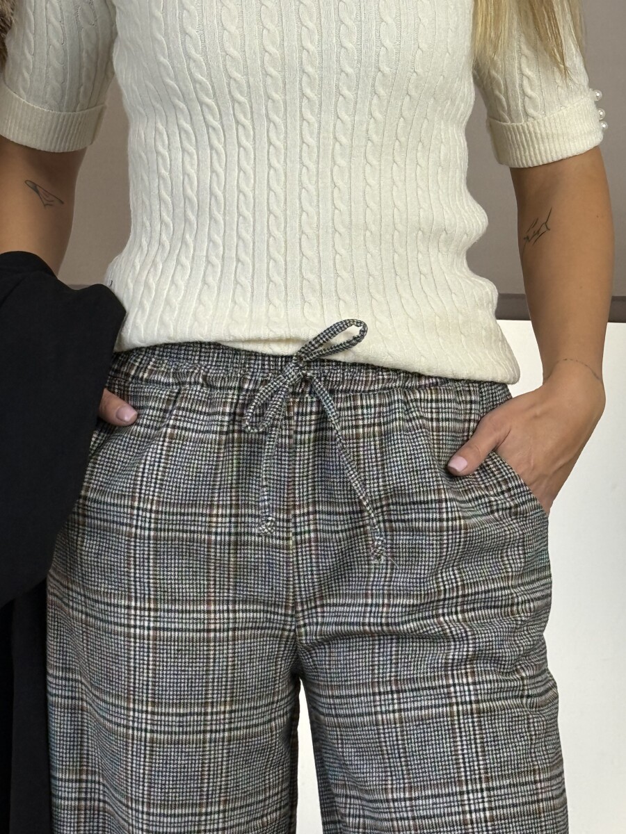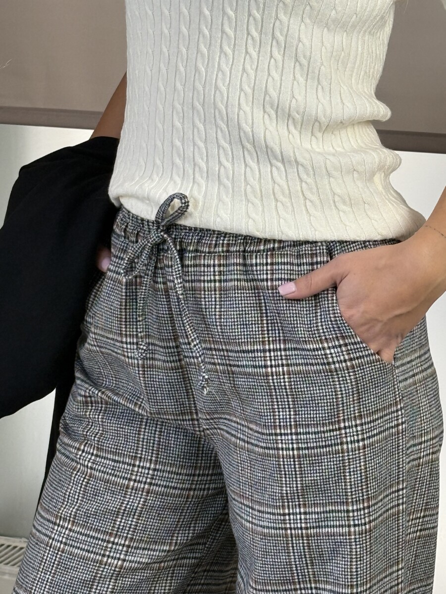 Bő egyenes szárú, gumis derekú, svéd zsebeskockás nadrág derekán dísz kötővel.