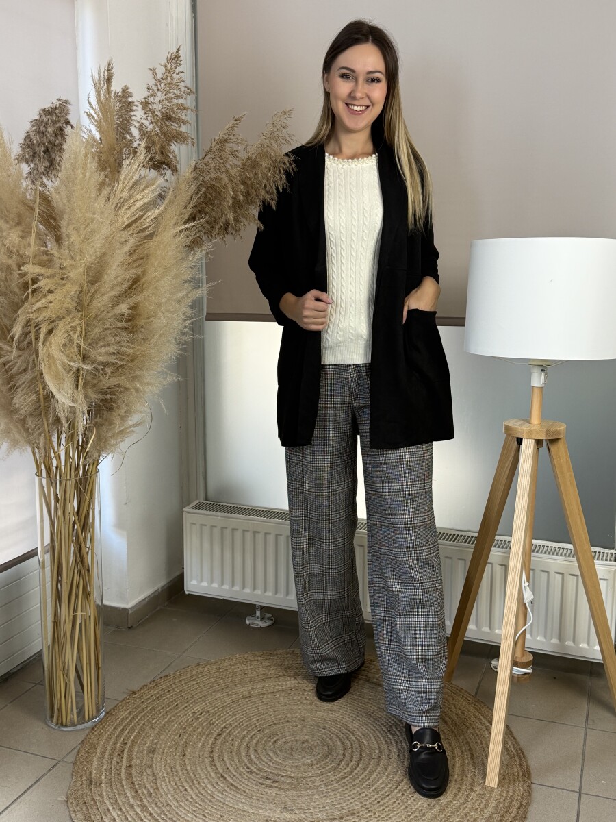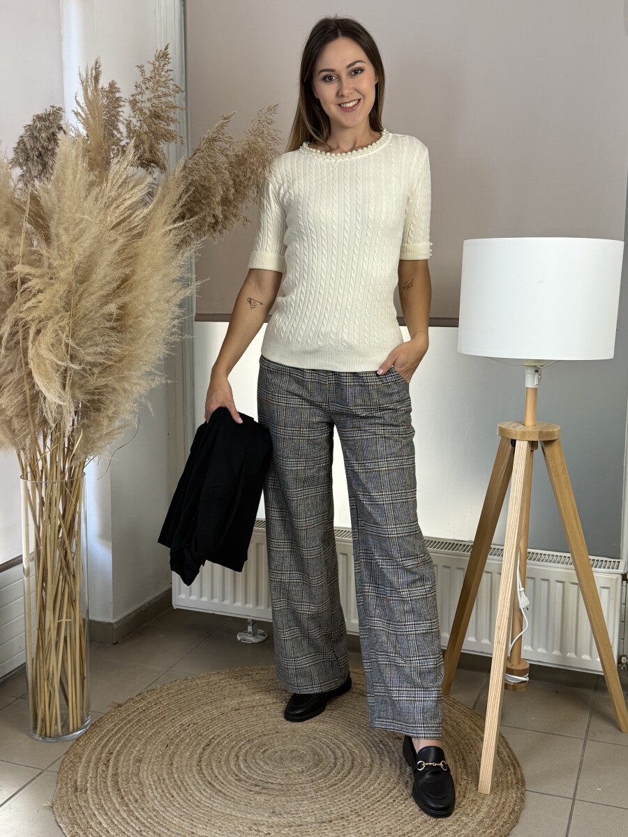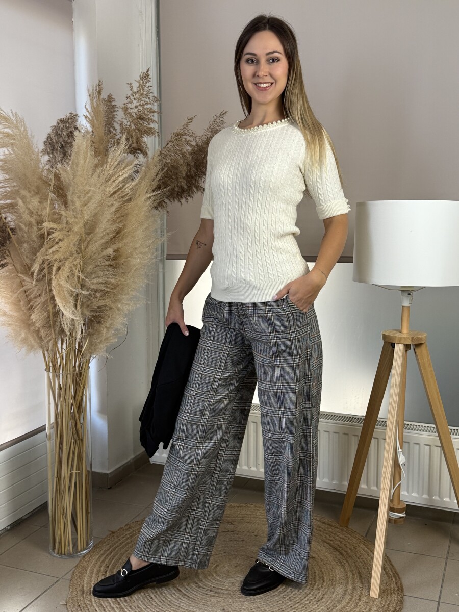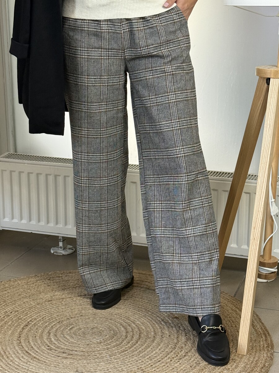 Bő egyenes szárú, gumis derekú, svéd zsebeskockás nadrág derekán dísz kötővel.