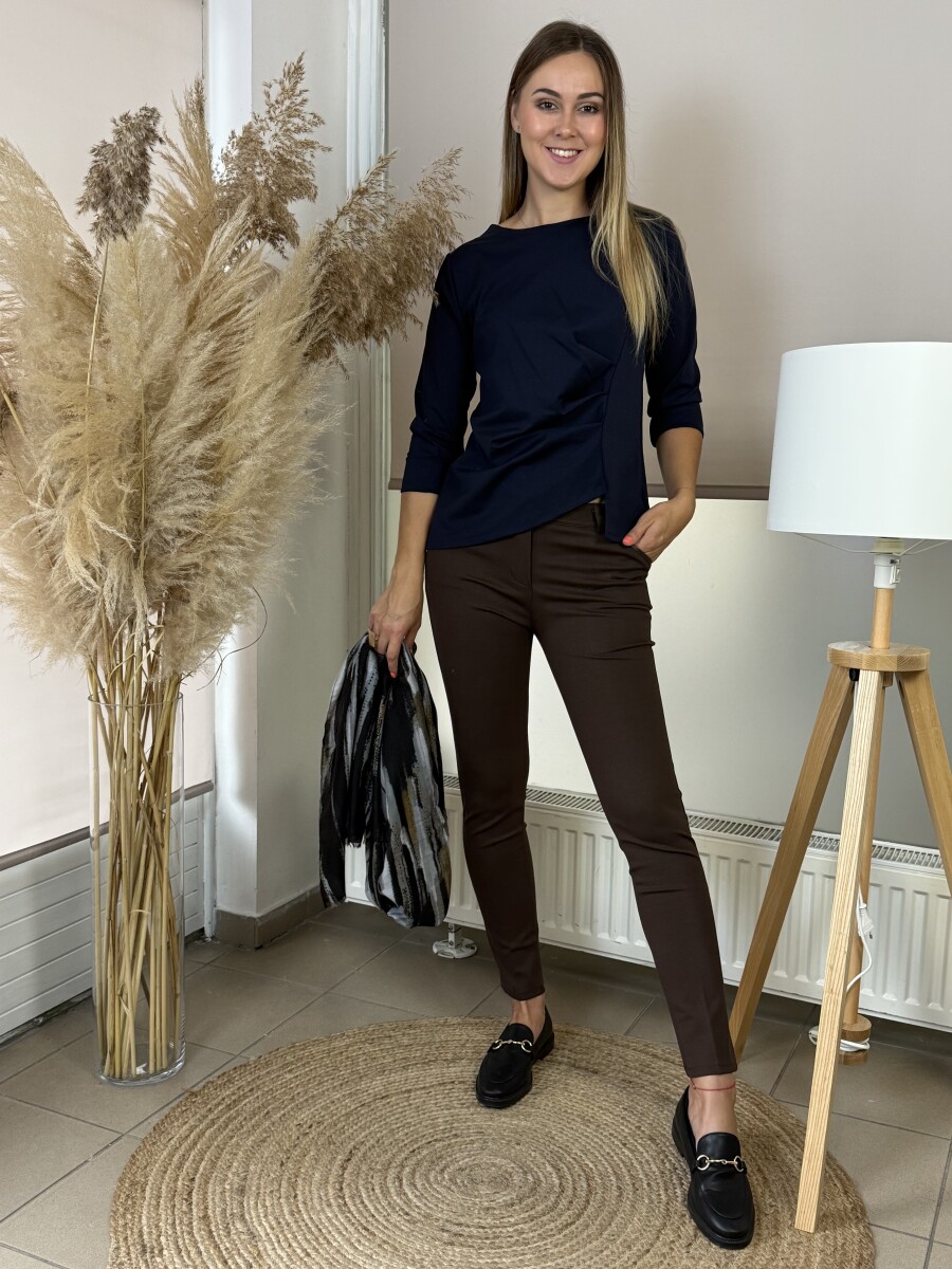 Egyenes szárú, testvonalat követő, enyhén rugalmas anyagú, cipzárral záródó, svéd zsebes, övbújtatós kényelmes viseletű csinos nadrág .