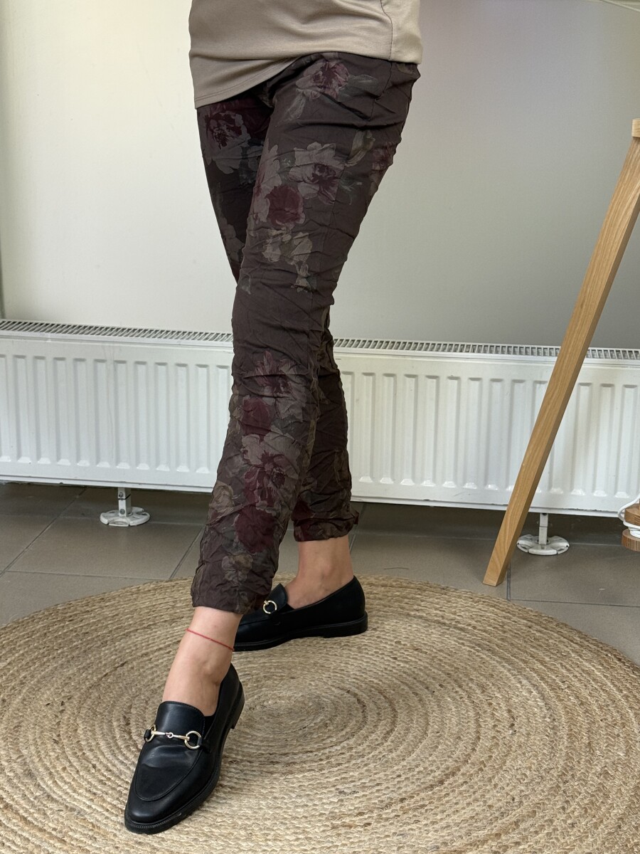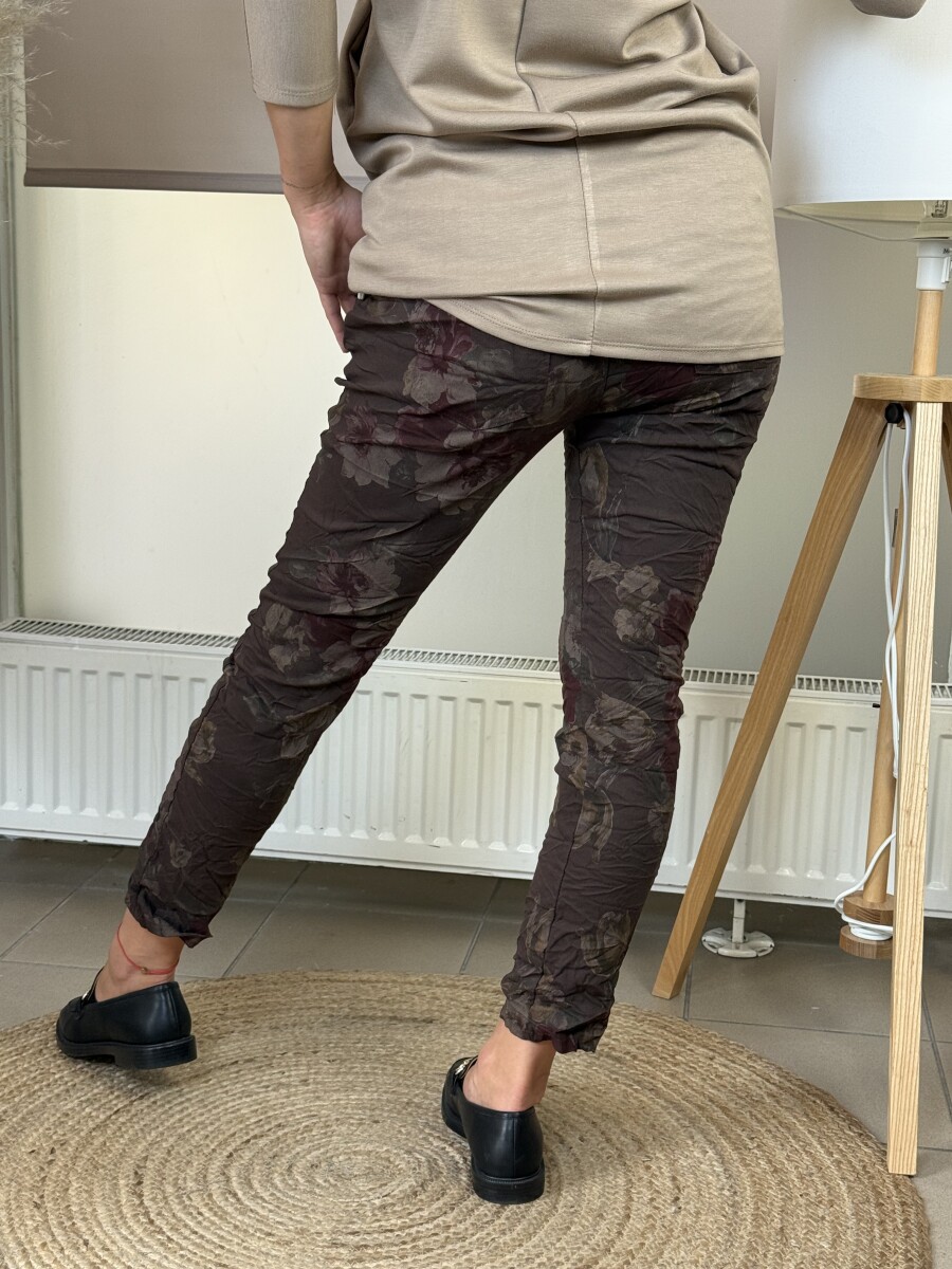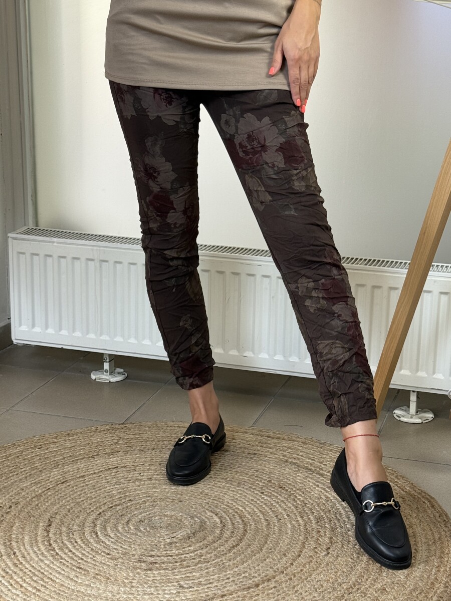 Gyűrt hatású, rugalmas anyagú, gumis és megkötős derekú, elején 2 svéd zsebes, laza, kényelmes viseletű mintás nadrág .