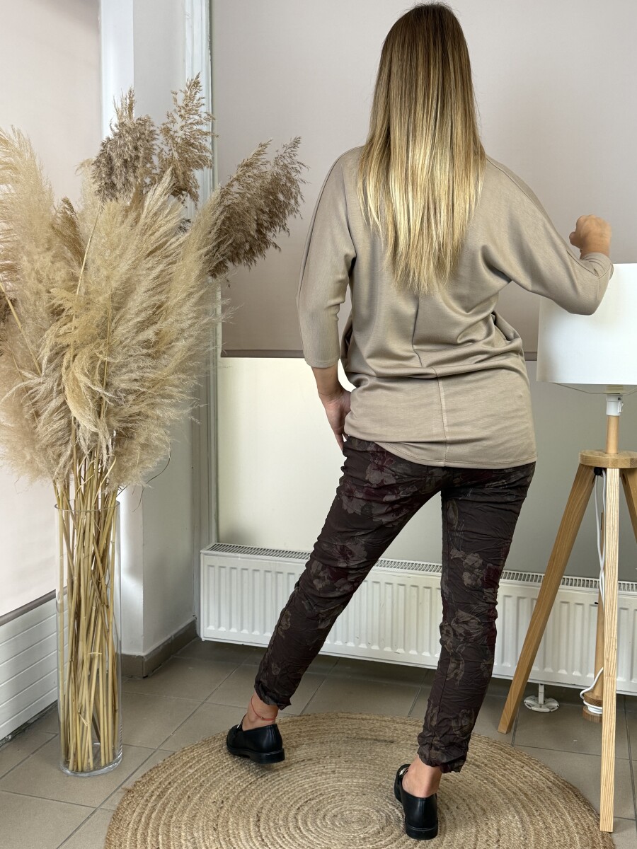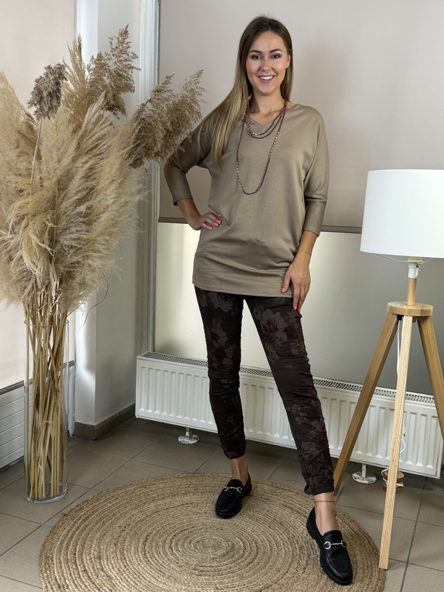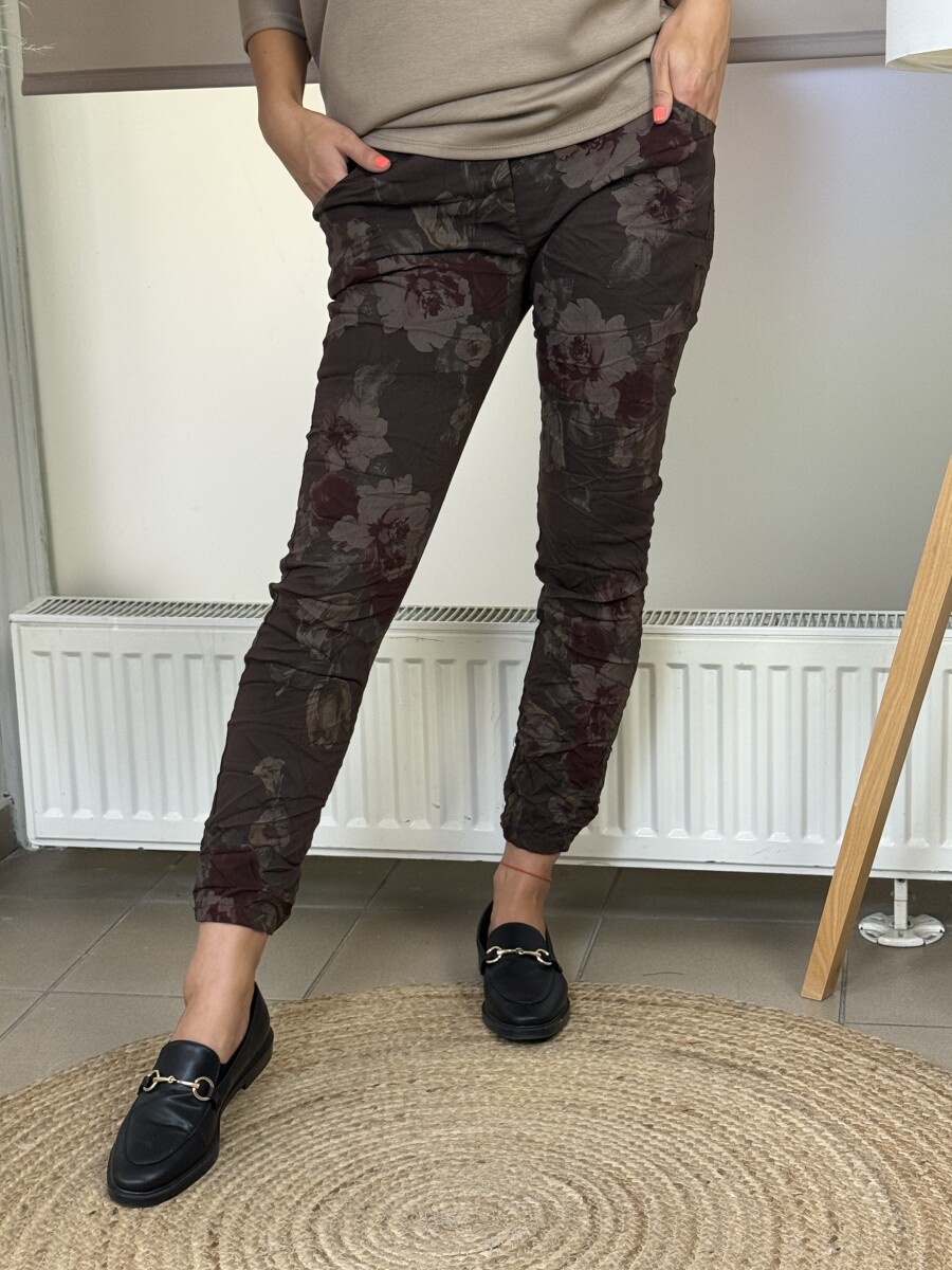 Gyűrt hatású, rugalmas anyagú, gumis és megkötős derekú, elején 2 svéd zsebes, laza, kényelmes viseletű mintás nadrág .